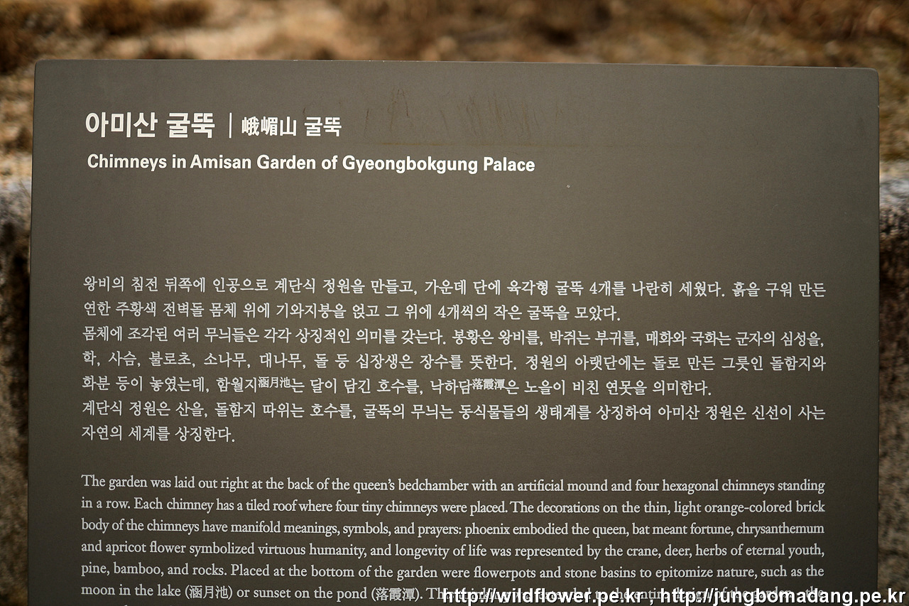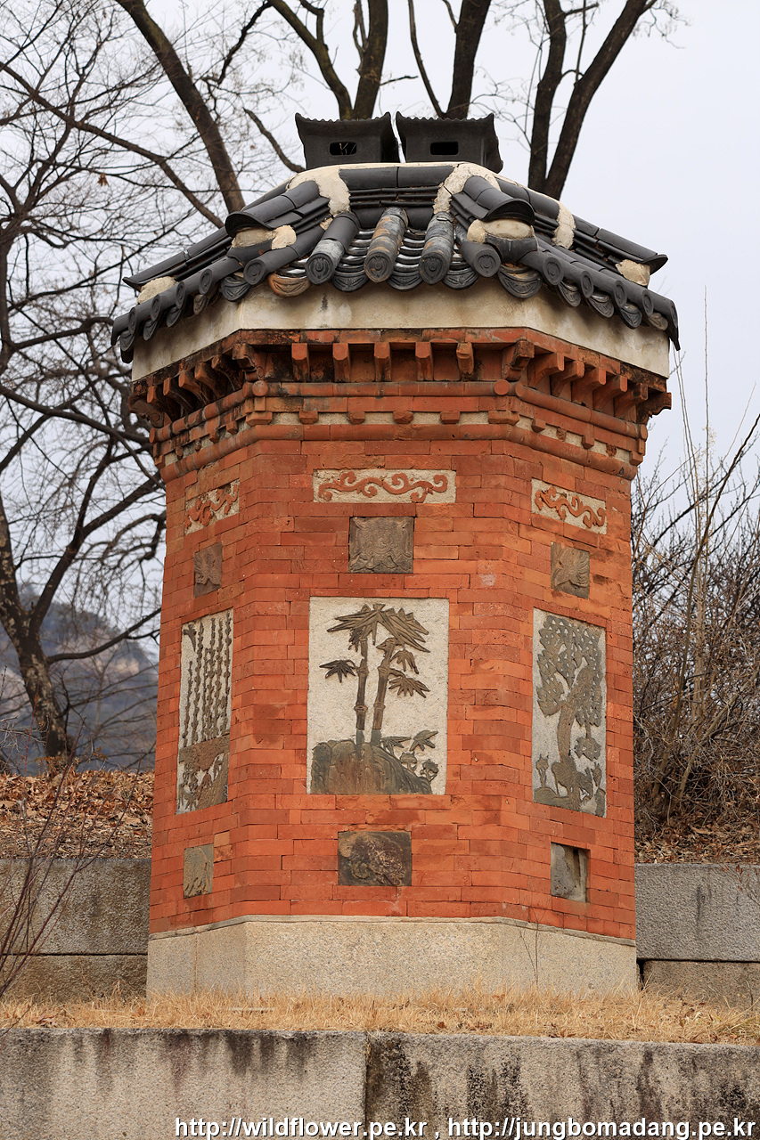 아미산 굴뚝 - 경복궁에 무슨 산이 있나? 아미산은 누에나방의 눈썹이라는 말로 미인의 눈썹을 비유하는 말입니다. 교태전 뒷편에 조성된 굴뚝으로 4기로 구성되어 있습니다.