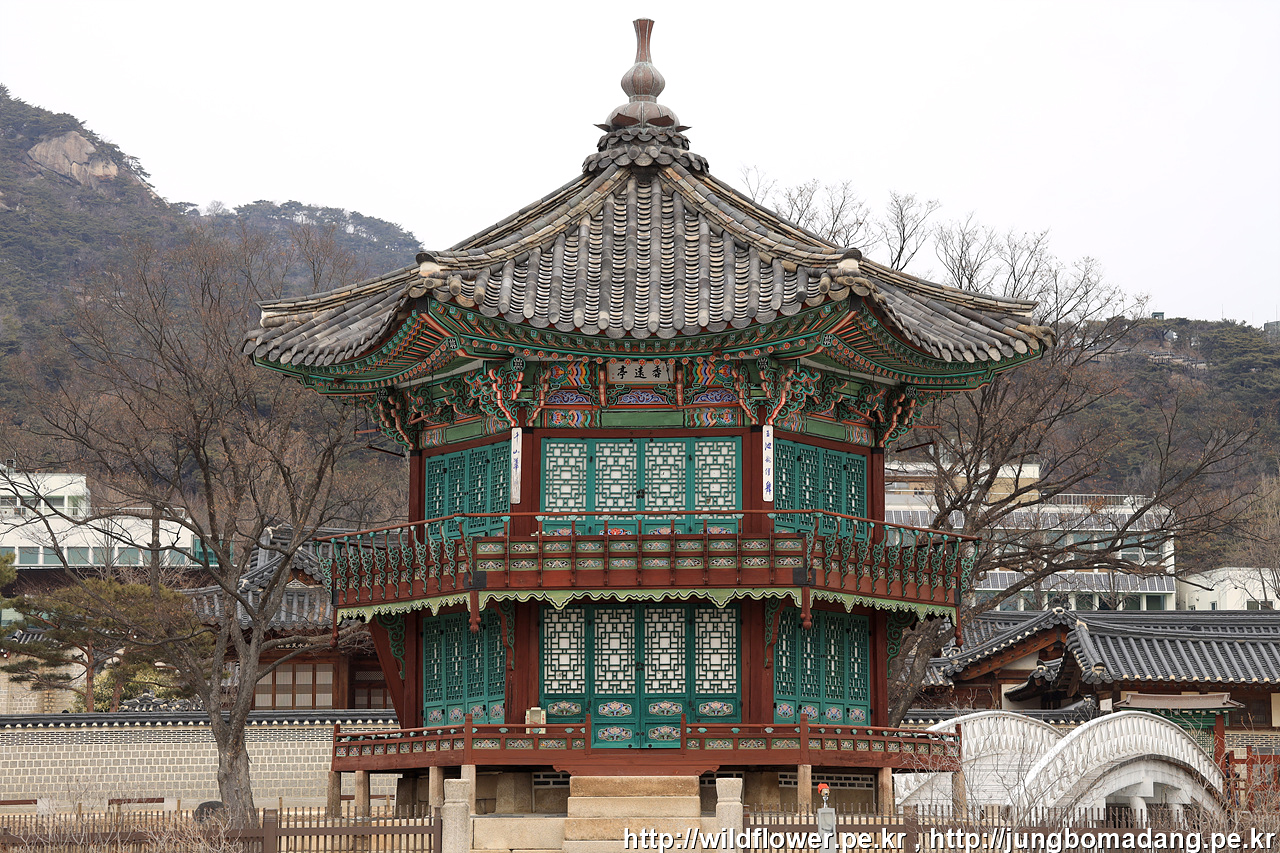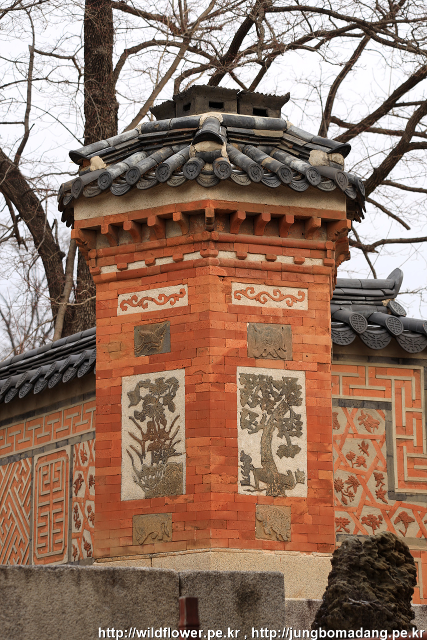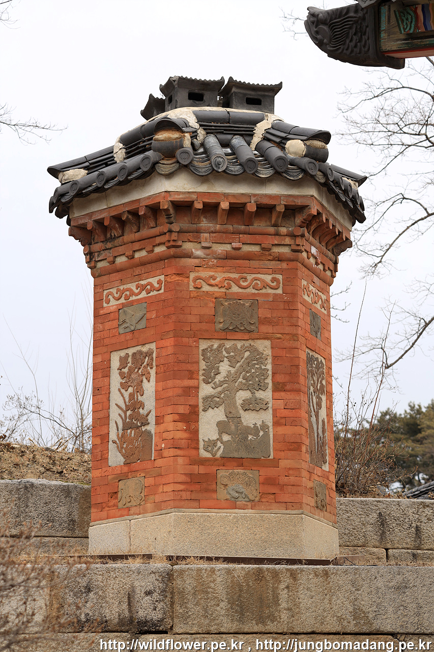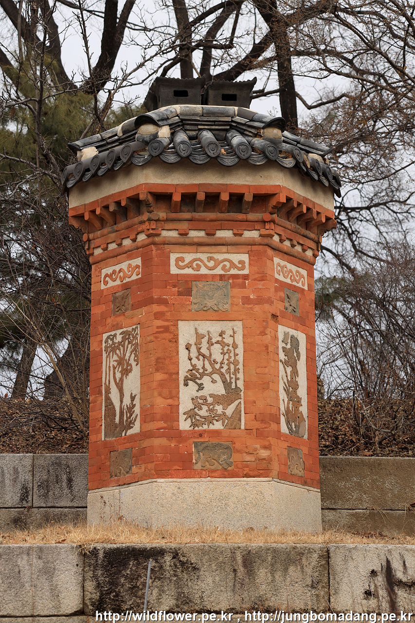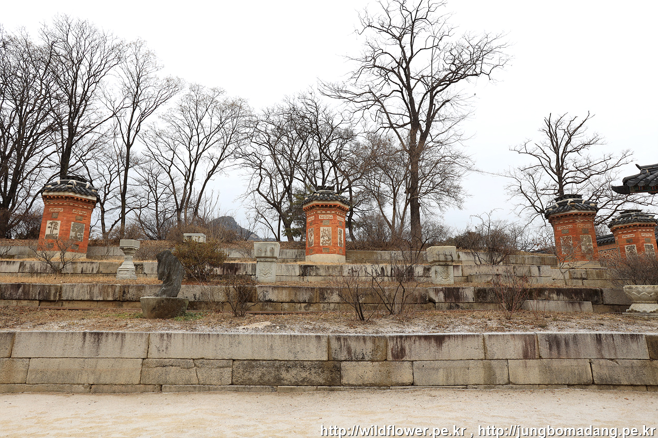 아미산 굴뚝 - 경복궁에 무슨 산이 있나? 아미산은 누에나방의 눈썹이라는 말로 미인의 눈썹을 비유하는 말입니다. 교태전 뒷편에 조성된 굴뚝으로 4기로 구성되어 있습니다.
