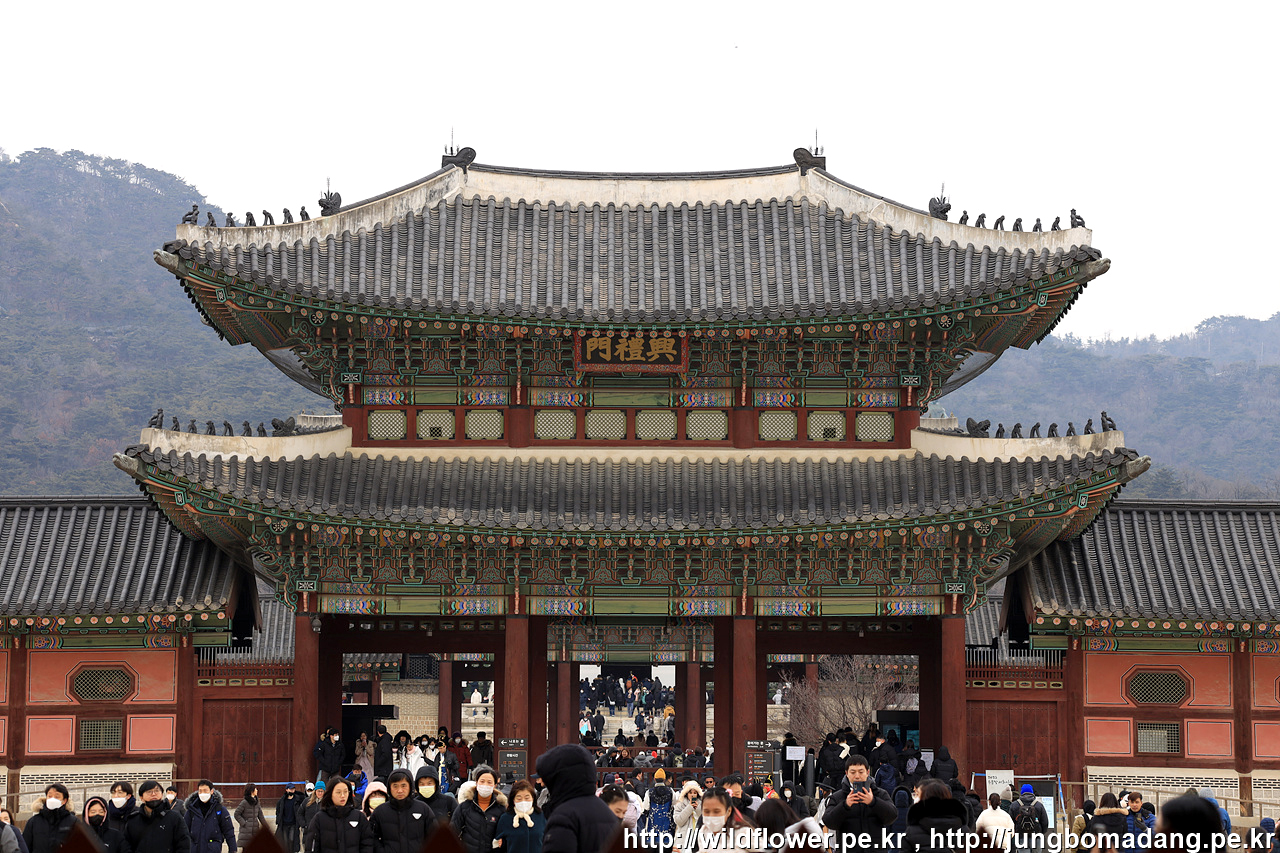 숭정문 - 흥화문 부터 숭정문까지 야외 구간은 평소에도 무료로 개방되어 산책등 가능한 곳이고, 숭정문 안쪽부터는 유료로 입장이 됩니다. 하지만, 오늘은 명절 무료 개방!. 답도가 보입니다. 답도는 임금 행차시 어가(임금 가마)가 지나가는 자리로 봉황이 그려져 있어 태평성대를 바라는 맘이 새겨져 있습니다. 단, 5대 궁궐중 덕수궁의 답도는 봉황이 아닌 용이 새겨 있는 데, 이는 대한제국인 황제국을 의미합니다.