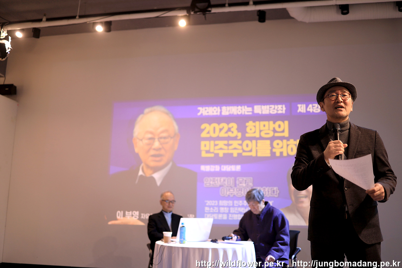 사회 - 이득신 작가님. 공동 주관사(돌베개 산악회, 민생경제연구소, 촛불행동) 인사 말씀 시간입니다.