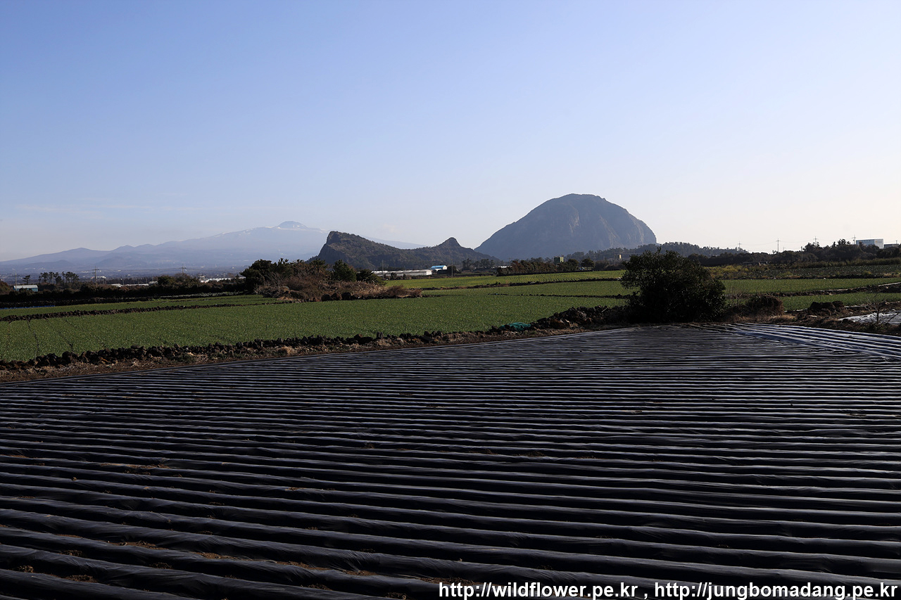 한라산(좌), 가시오름(중), 산방산(우), 모슬봉(우)