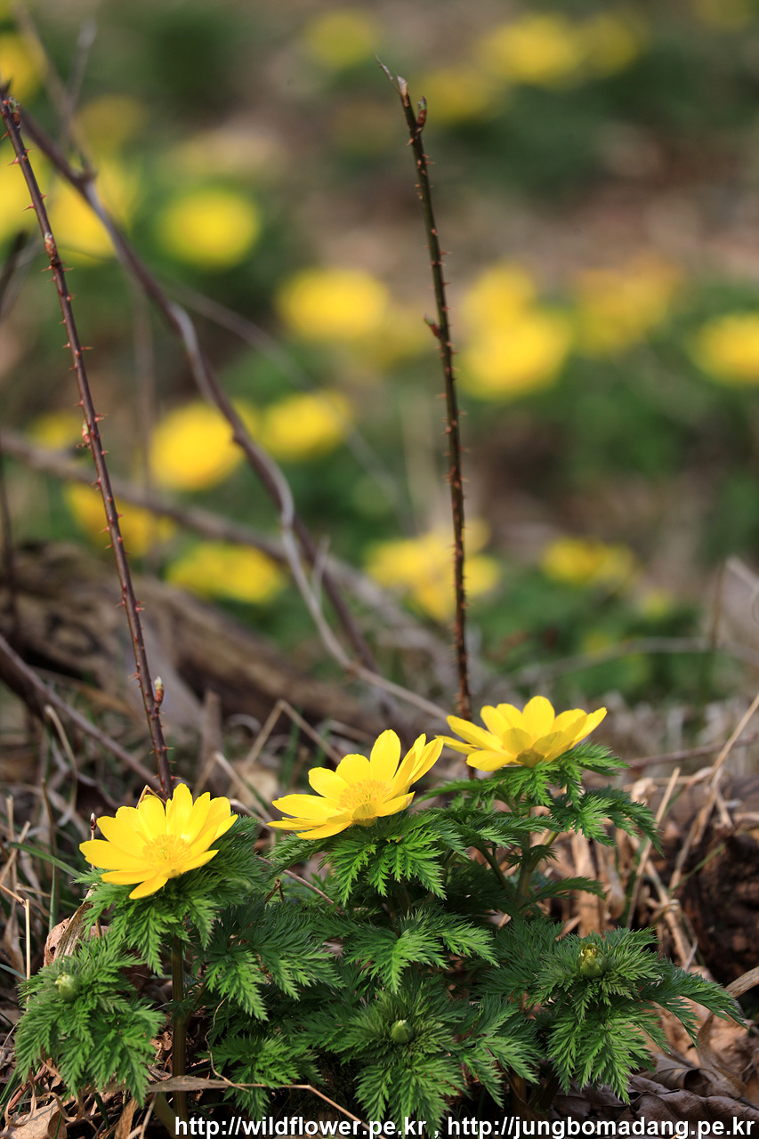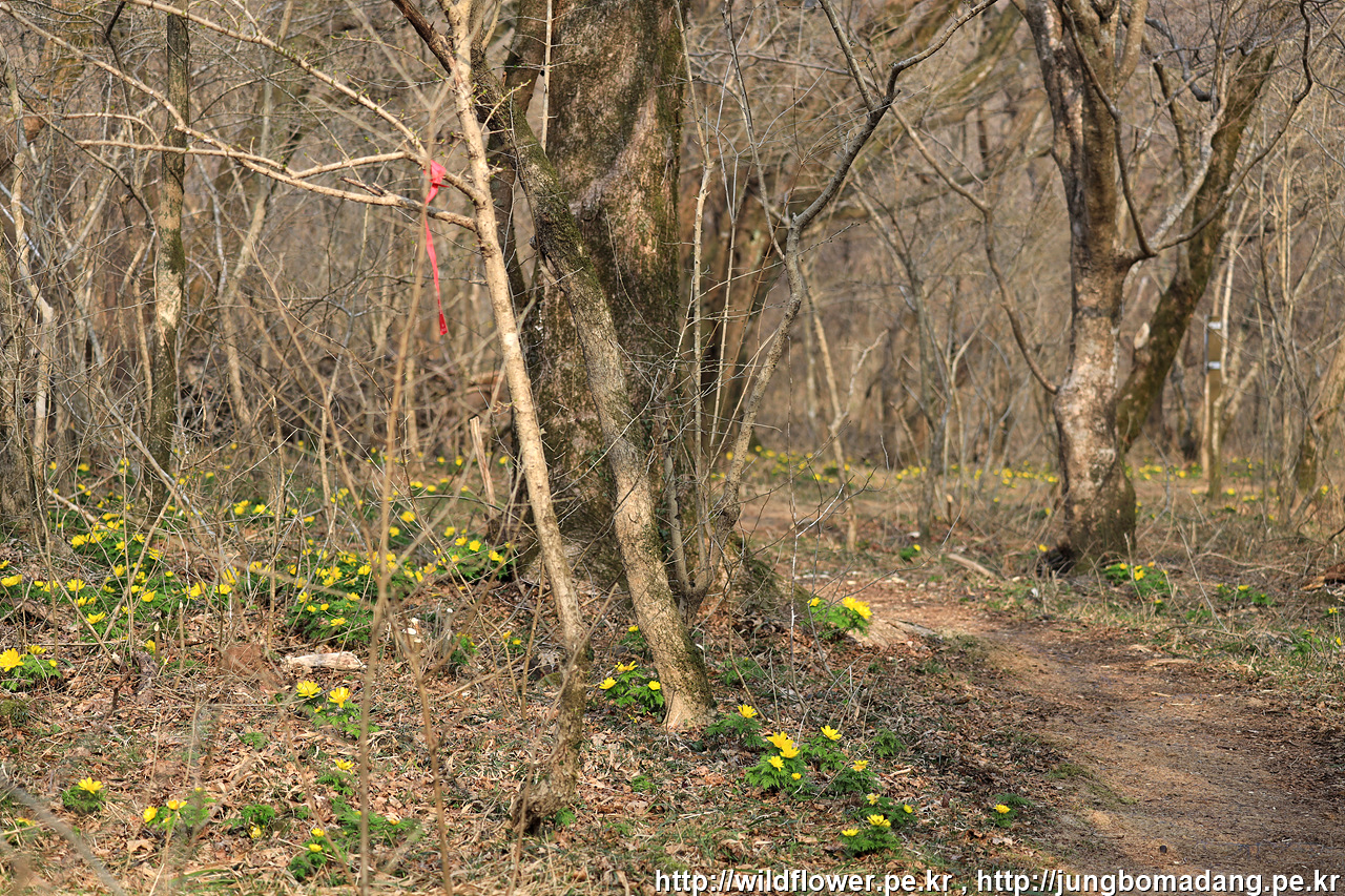 꽃길이라 할만 하죠? 세복수초의 노란 물결입니다.