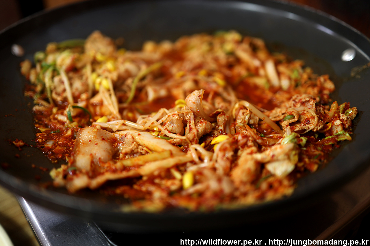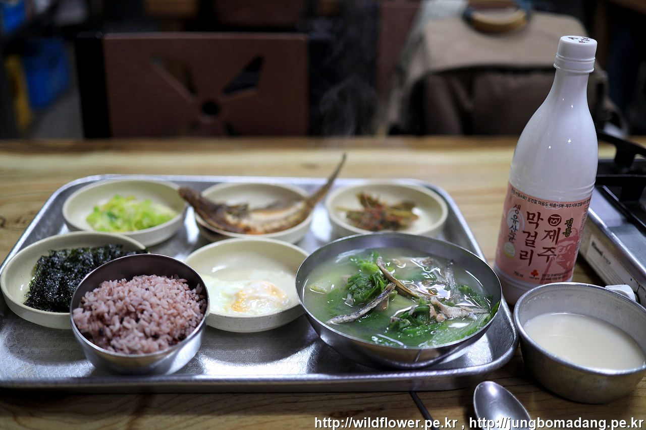 오전에 튀겨주신 가자미가 조림으로 나왔네요. 이것은 단골인 제게 이모님들 반찬 중 하나를 선뜻 내어주신 겁니다. 그 외 주문한 것은 두루치기와 막걸리.
