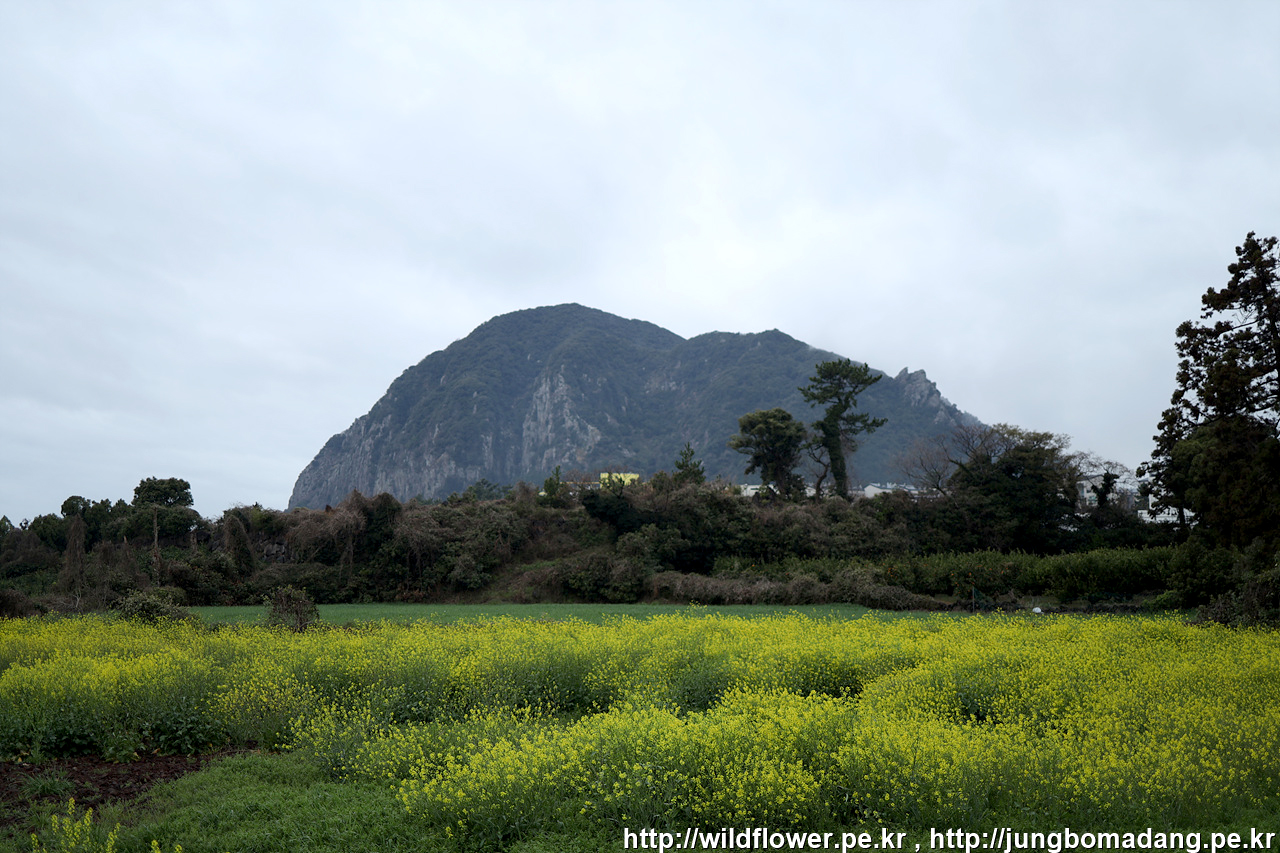 어느 밭의 유채꽃 뒤로 산방산이 보입니다.