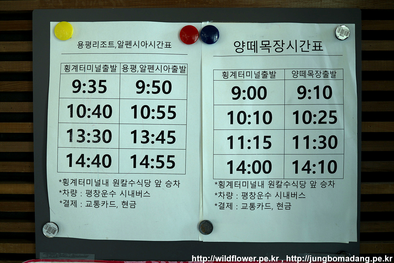 양떼목장 시간표. 양떼목장에서 되돌아오는 막차 시간은 14시 10분이네요. 음... 그럼 오늘은 강릉으로 안가고 횡계로 원점회귀 하는 쪽으로 경로를 수정해야 겠네요.