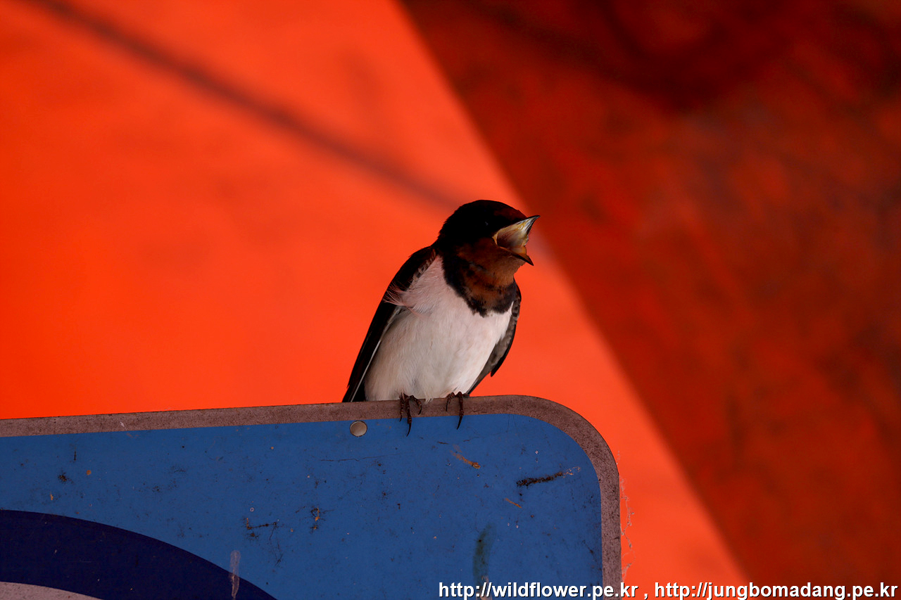 이른 아침 아직 열지 않은 수퍼마켓 간판 위에 제비 한마리가 울고 있습니다.