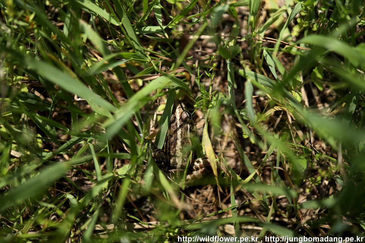 개구리 한마리가 풀 숲에 숨어 있습니다.