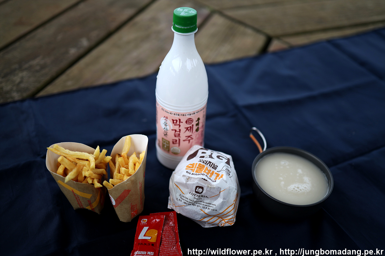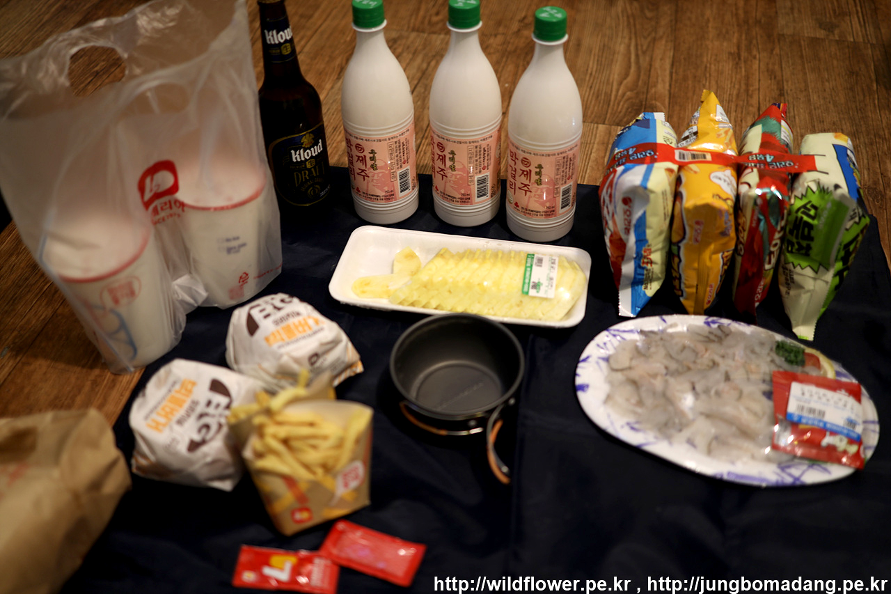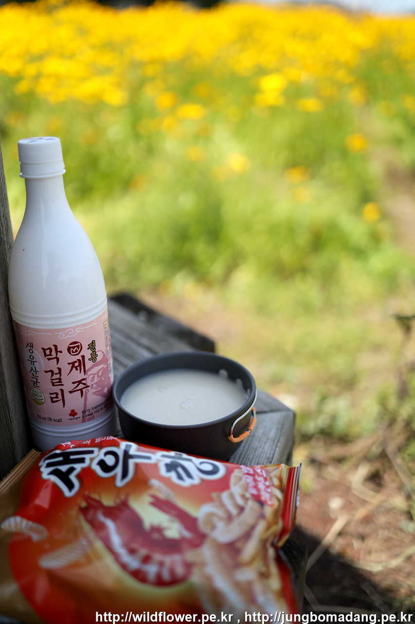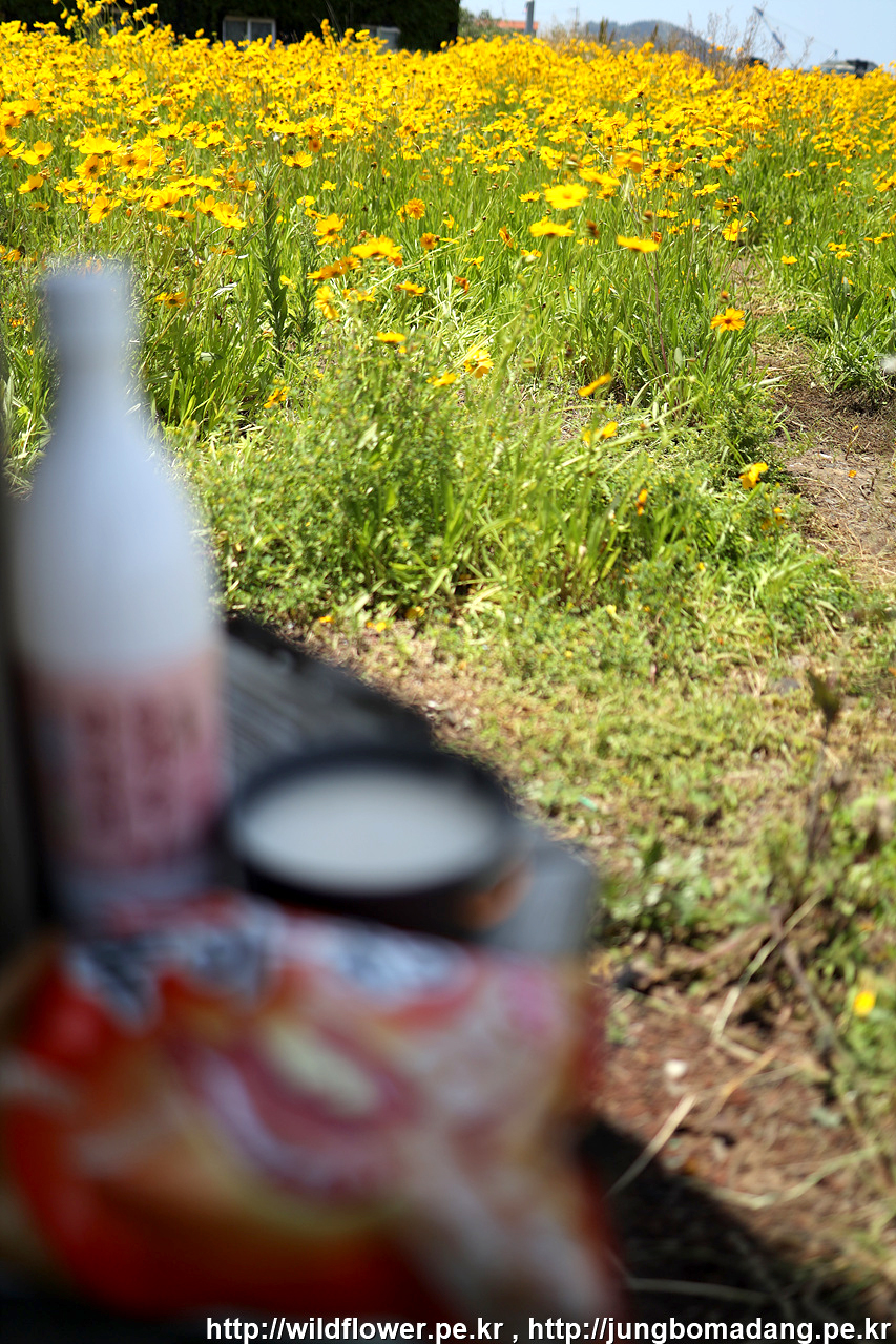 금계국이 피어 있는 곳. 그냥 지나칠 수 없어서 근처 편의점에 들려 막걸리하나 과자 하나 사옵니다.