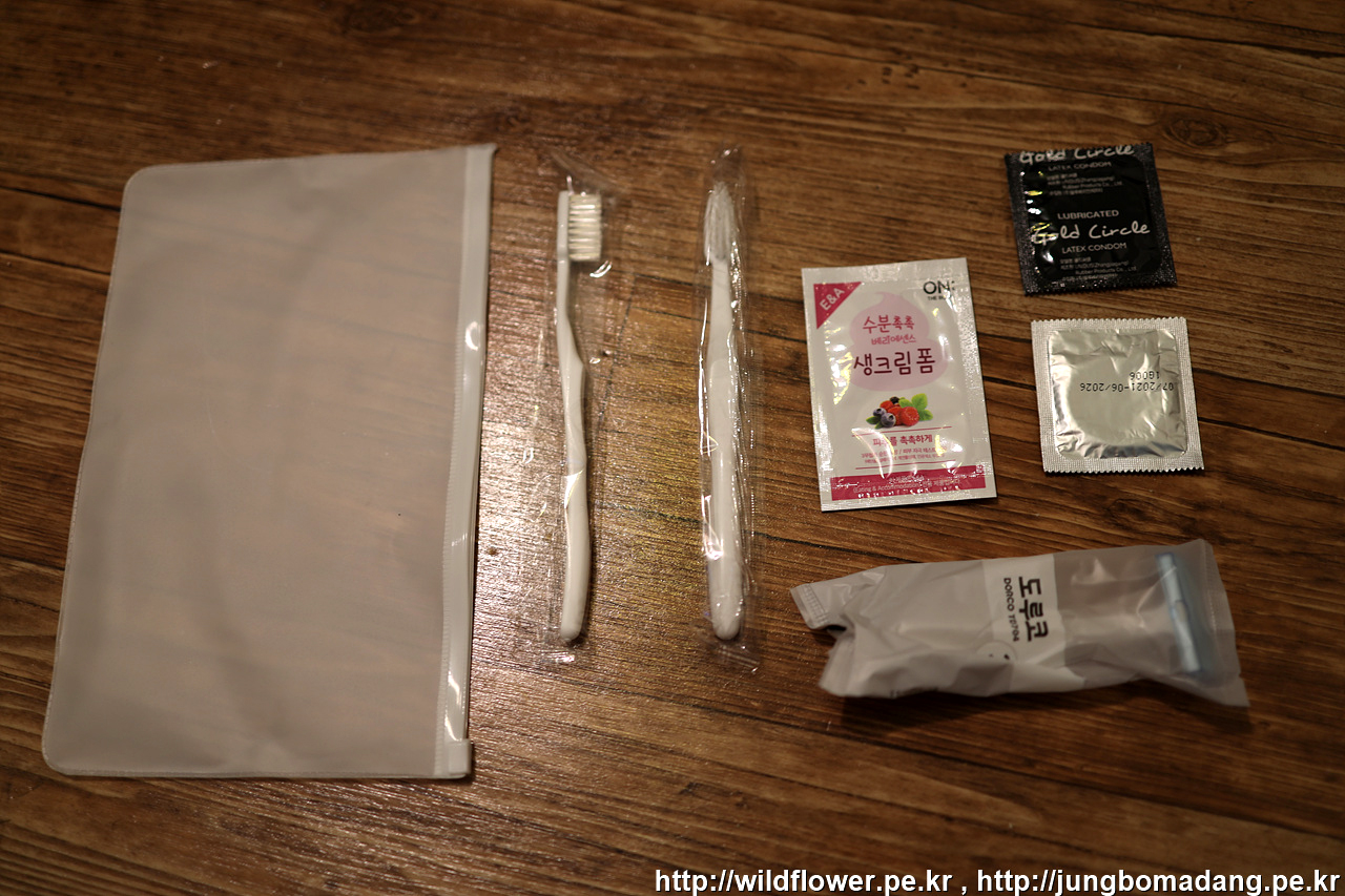분명 숙박 어플에서는 혼자 자는 걸로 예약 했는 데, 콘*은 왜 준걸까요? 면도기, 칫솔, 콘*은 그대로 책상 위에 두고 나옵니다.