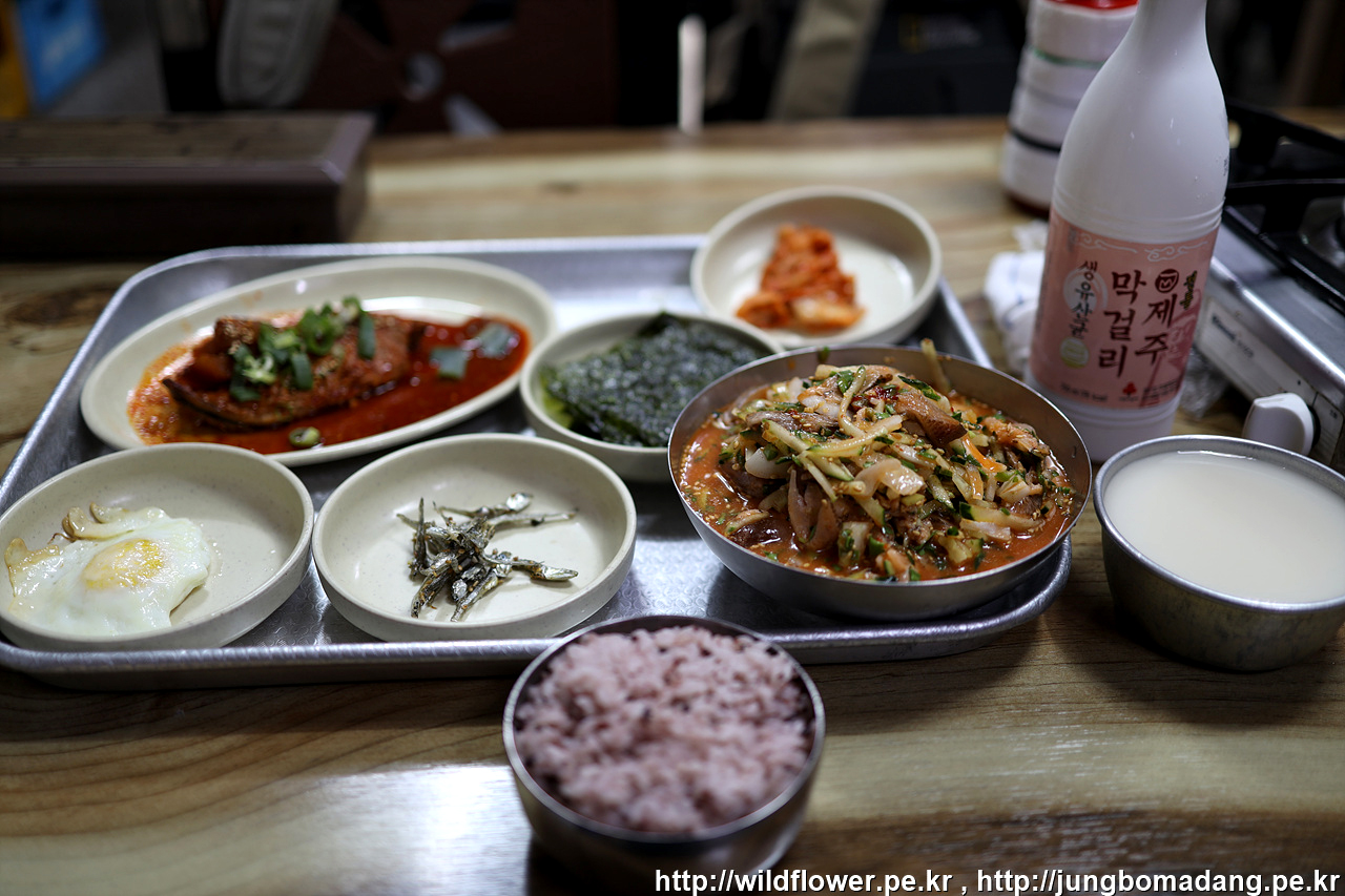 담날이 되어 새벽 6시 기상 후 가파도에 청보리가 남았나 확인하러 가는 길 우선 현옥식당의 자리물회(13000원) + 제주막걸리(3000원)으로 배를 든든히 채웁니다.