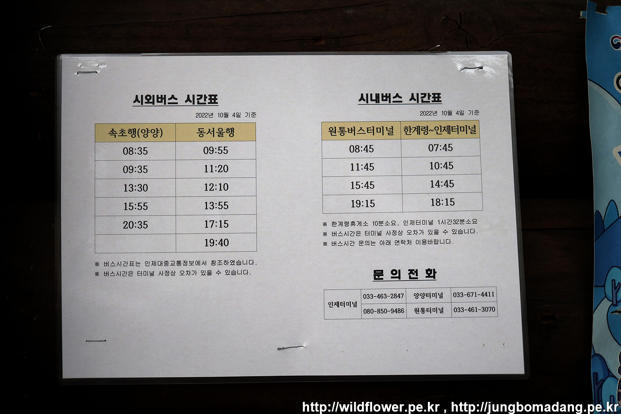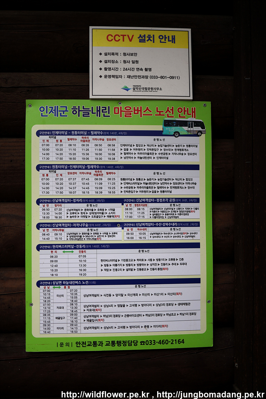 장수대 도착하니 버스정류장이 뭔가 바뀌어 있고, 시간표가 붙어 있지 않아서 장수대분소에 가 보니 시외버스 시간표, 시내버스 시간표가 붙어 있어서 일단 한장 담아 봅니다.