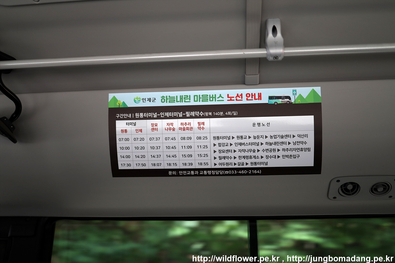 시내버스 시간표는 [하늘내린 마을버스]라는 이름의 마을버스로 하루 4회 운항하며 원통터미널에서 출불하여 필례약수를 기점으로 되돌아서 원통버스터미널로 되돌아가는 버스가 아래와 같이 8:45, 11:45, 15:45, 19:15 있습니다.