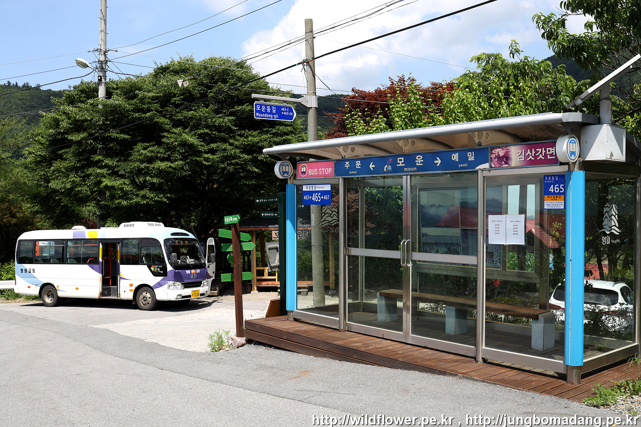 버스가 35분 후 주문리종점(모운동)에 도착합니다. 시간을 아끼기 위해 아래 에밀 정류장까지 가야하는 데, 10시 50분에 타고온 버스가 지나가므로 잠시 승차 대기했다가, 기사님 출발 시 버스 카드를 다시 찍는 지 문의하니 이어서 가는 거라 그런 지 안찍어도 된다고 해서 출발 후 싸리재 정류장 다음인 예밀 정류장에서 하차합니다. 주문리종점(모운동)에서 예일정류장까지는 버스로 약 6~7분 소요됩니다. 아래 사진은 주문리종점에서 대기시 잠시 내려서 찍은 것입니다. 예밀정류장에서 굽이길을 지나 망경산사에 들리고, 만경사길을 통해 만경사를 다녀온 후 낙엽송삼거리에서 명상길, 광부의길 2구간을 통해 운탄삼거리에서 흰색 라인을 따라 현위치인 주문리종점(모운동)까지 되돌아 오는 여정입니다. 제 기준으로 쉬는시간 50분 포함하여 7.5Km 약 3시간 40분 소요되었습니다. 참고로 영월 시내로 되돌아 가는 버스는 14시 50분에 주문리종점(모운동)에서 출발하여 3시간 56분 정도 시간이 필요하므로 시간이 빡빡하다 생각되면 명상길, 광부의길 2구간을 포기하고 여유있게 굽이길, 만경사길만 이용하여 원점회귀하여 예밀정류장에서 영월로 복귀하는 방법도 참고하시길 바랍니다.
