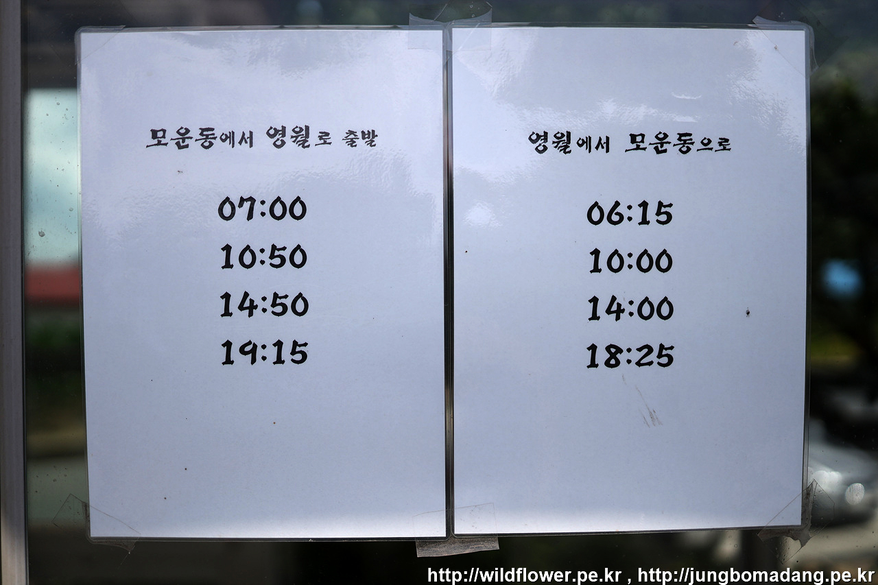 서울에서 교통편을 처음에 왕복 모두 열차(무궁화호)로 정했다가, 만경사를 방문하기 위해 모운동(주문리)이라는 곳을 가야 하는 데, 하루 버스가 4편 운행 되고, 시간상 오전 10시에 영월 시내에서 출발하는 버스를 타야하는 데, 열차의 경우 청량리에서 첫차를 이용 하더라도 영월역에 10시 2분에 도착하여, 해당 버스를 이용하기 어려워서, 찾아보니 동서울에서 7시에 출발하는 버스를 타면 2시간 20분 후인 약 9시 20분에 영월시외버스터미널에 도착하는 것으로 확인되어, 갈때는 버스, 올때는 열차 이렇게 교통편을 정리 했습니다.