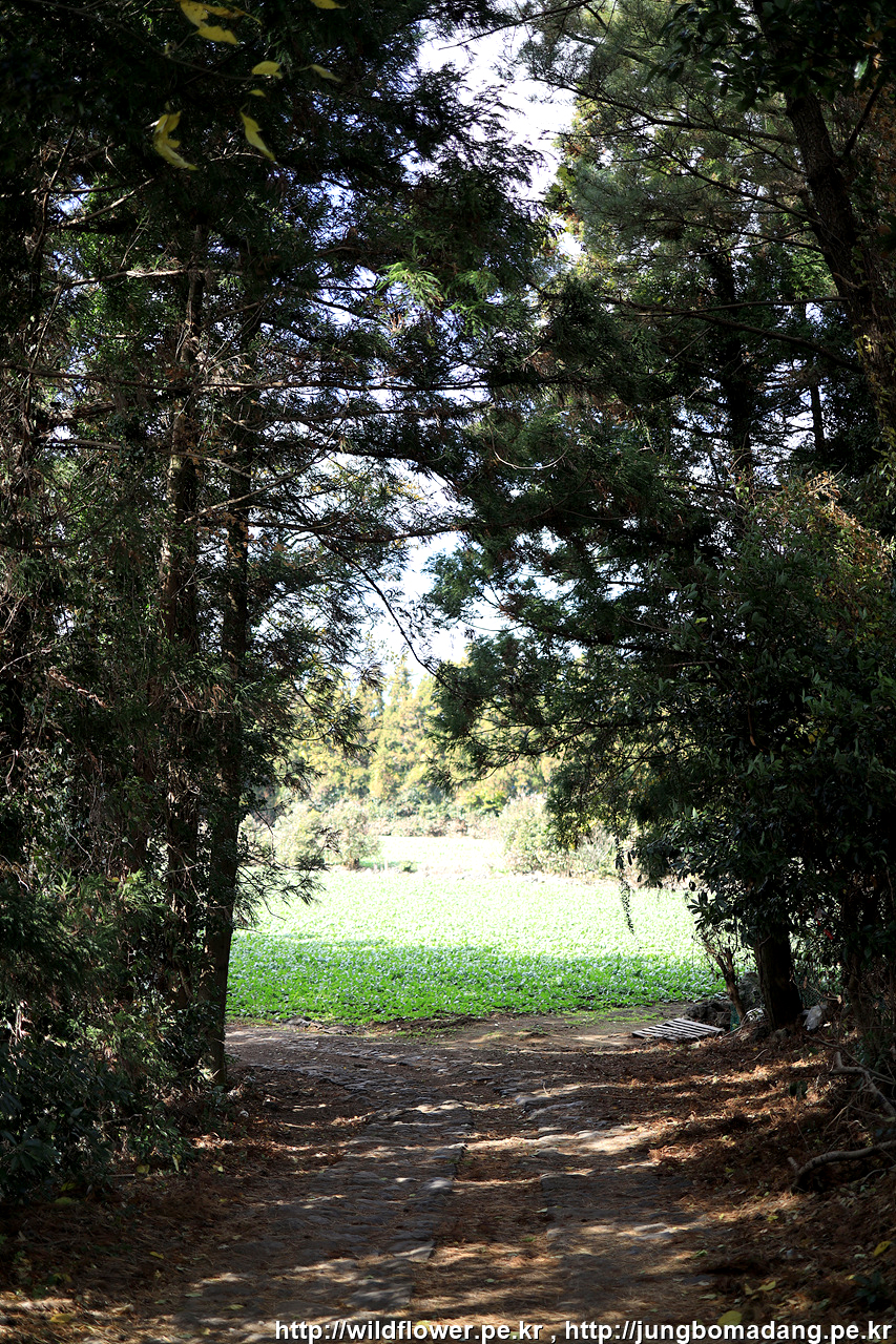 좌측에 사유지로 보이는 넓은 터가 보이고 우측의 삼나무 사이로 가야하는 데, 여기서 사나운 개가 짖어 대니 조심해서 지나가시길 바랍니다. 묶여 있는 듯 보입니다.