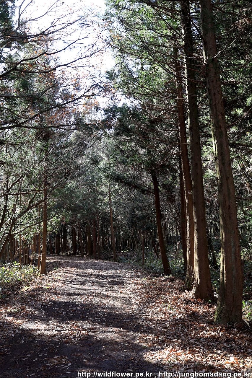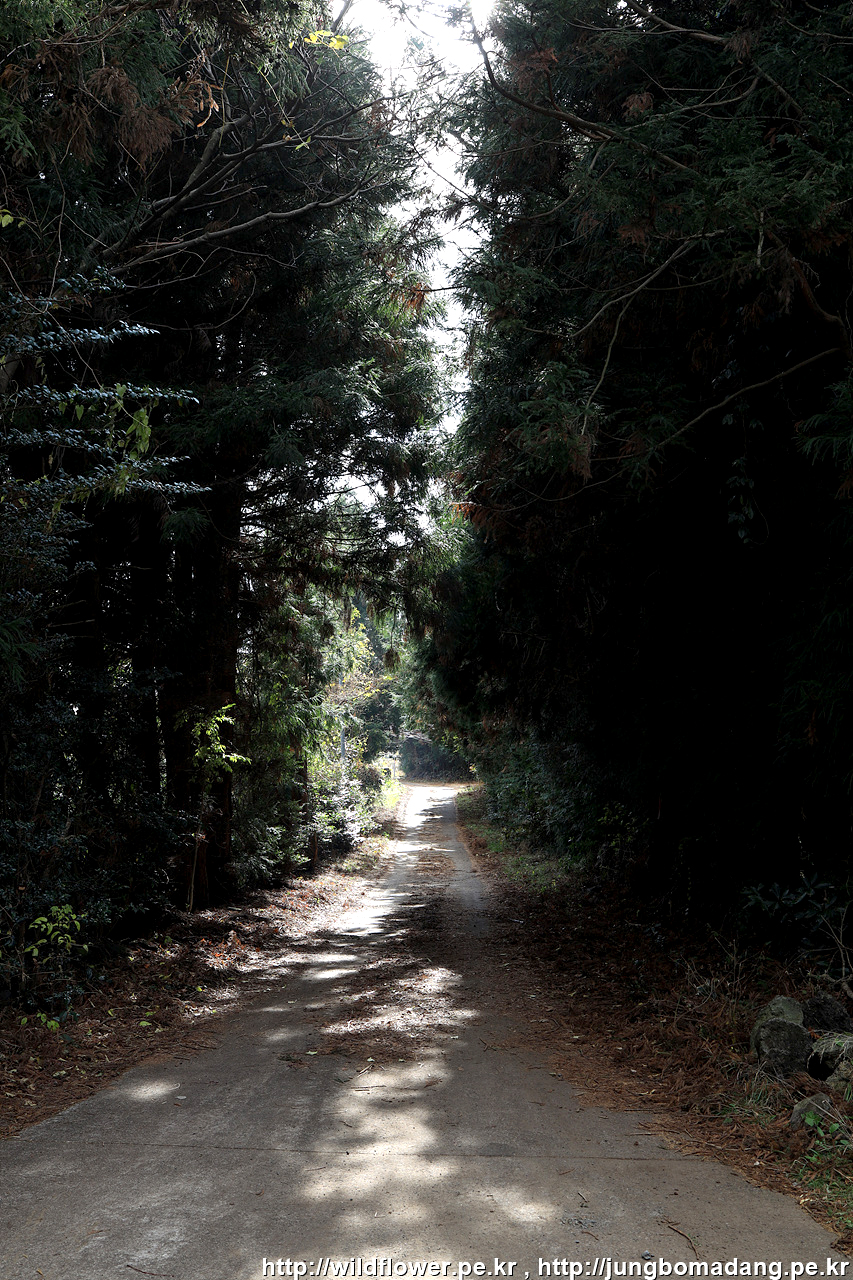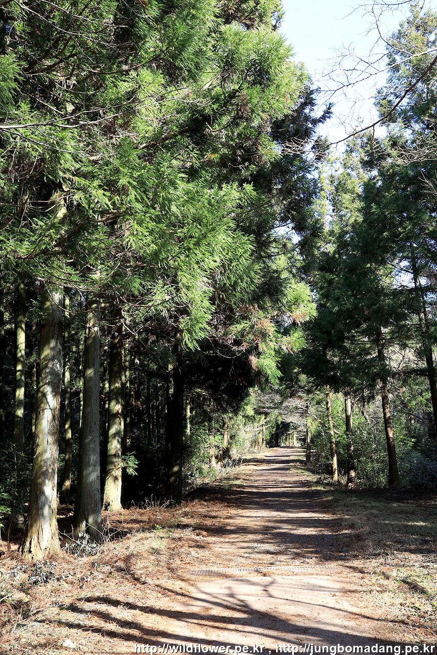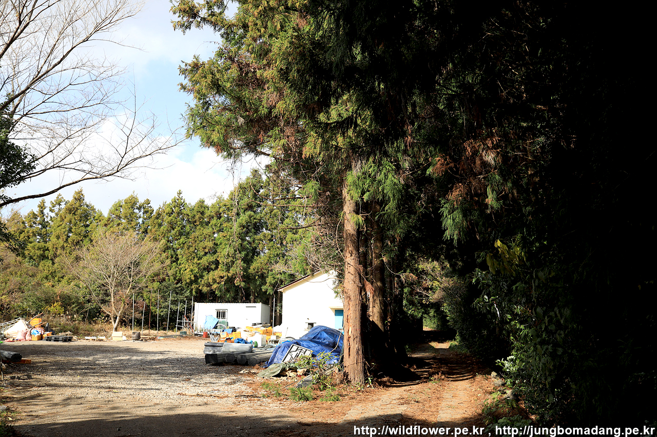 좌측에 사유지로 보이는 넓은 터가 보이고 우측의 삼나무 사이로 가야하는 데, 여기서 사나운 개가 짖어 대니 조심해서 지나가시길 바랍니다. 묶여 있는 듯 보입니다.