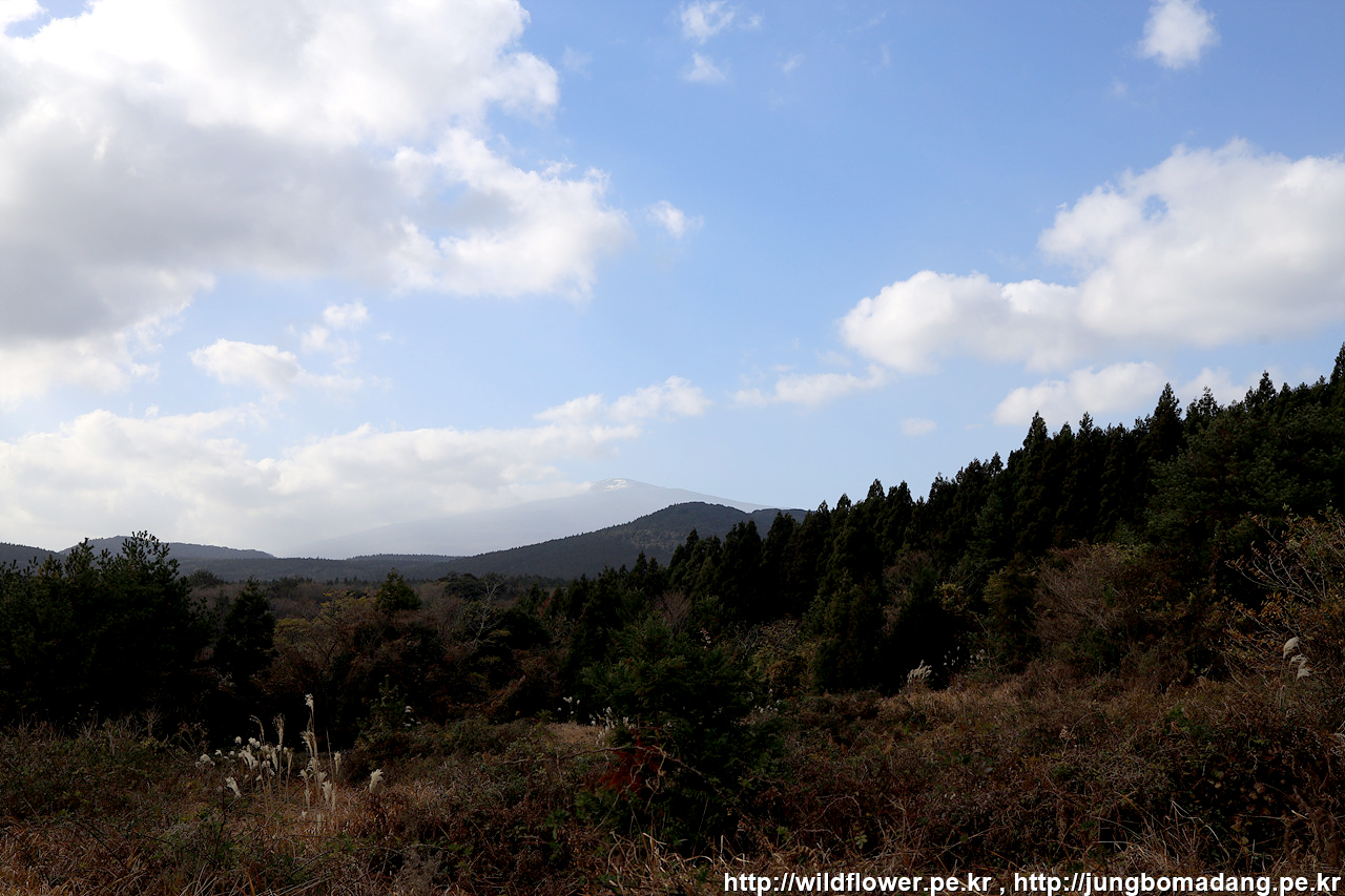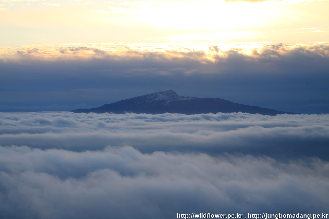 이륙 후 50분이 될 무렵 구름을 가르며 한라산 정상이 나타납니다.