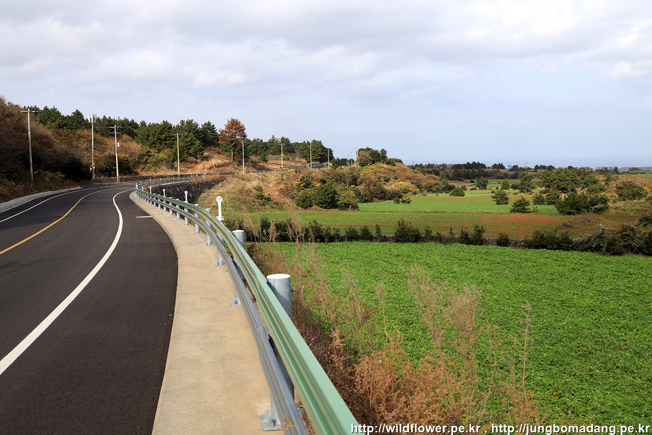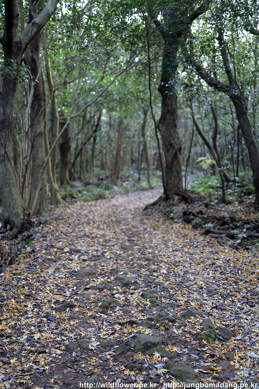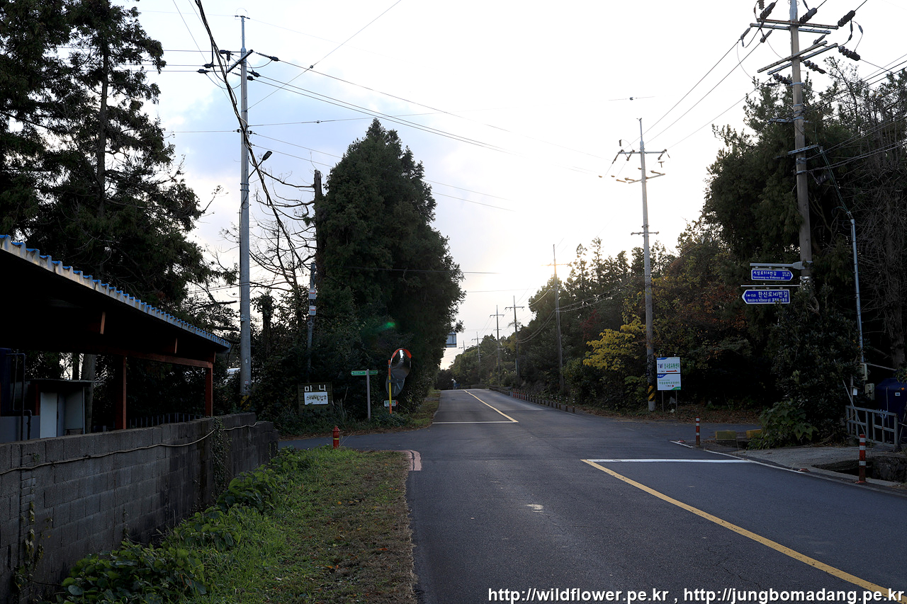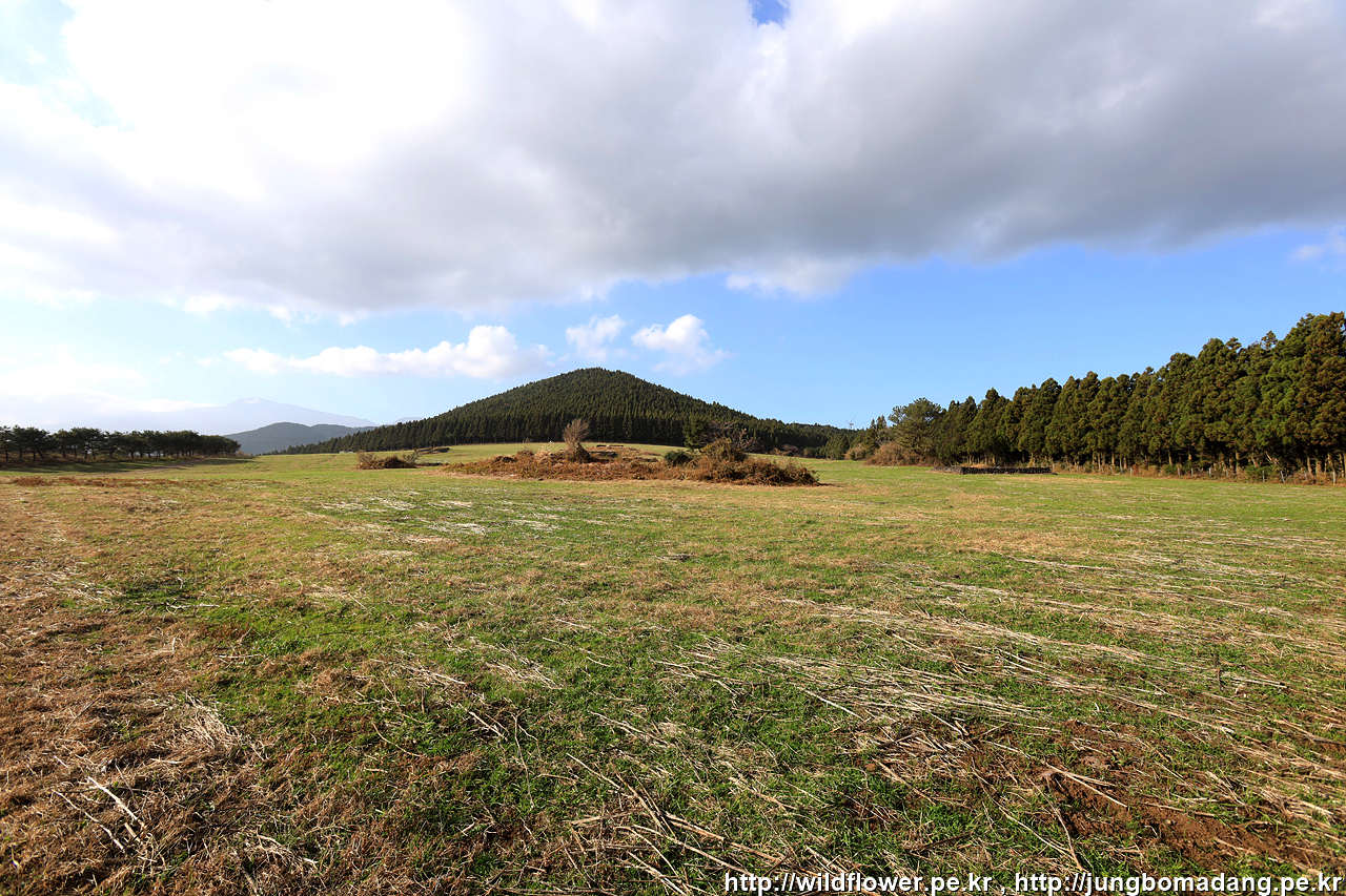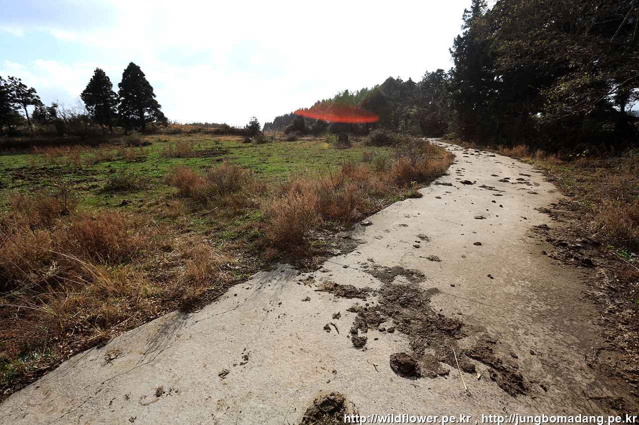 중간에 좌측편으로 나무가 심어진 경사가 시작되는 곳이 오름 내려가는 곳과 이어지는 삼거리 입니다.