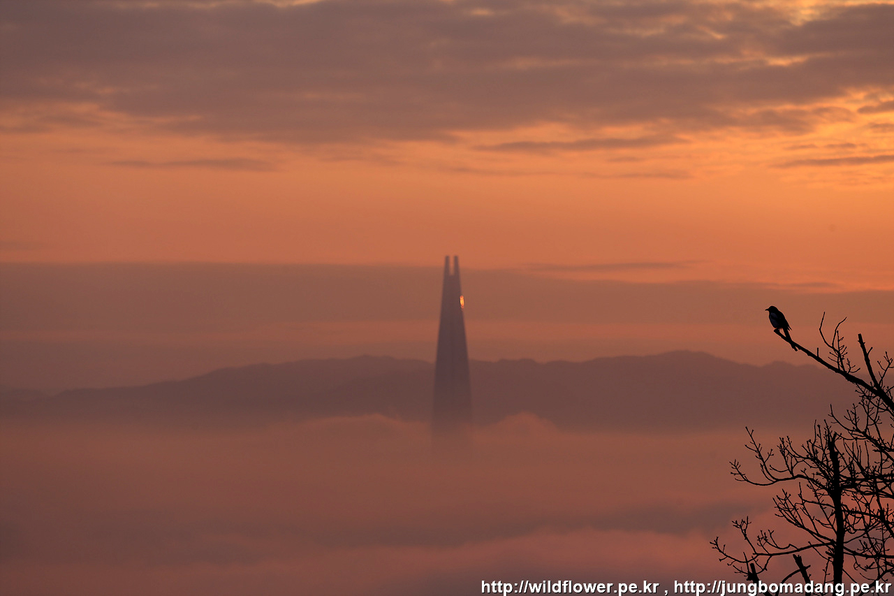 남한산성 위로 힘차게 햇님이 솟구치기 시작합니다. 근데 일출을 보기 위해 나만 온 게 아니군요? 가운데 까치 한마리 등장!
