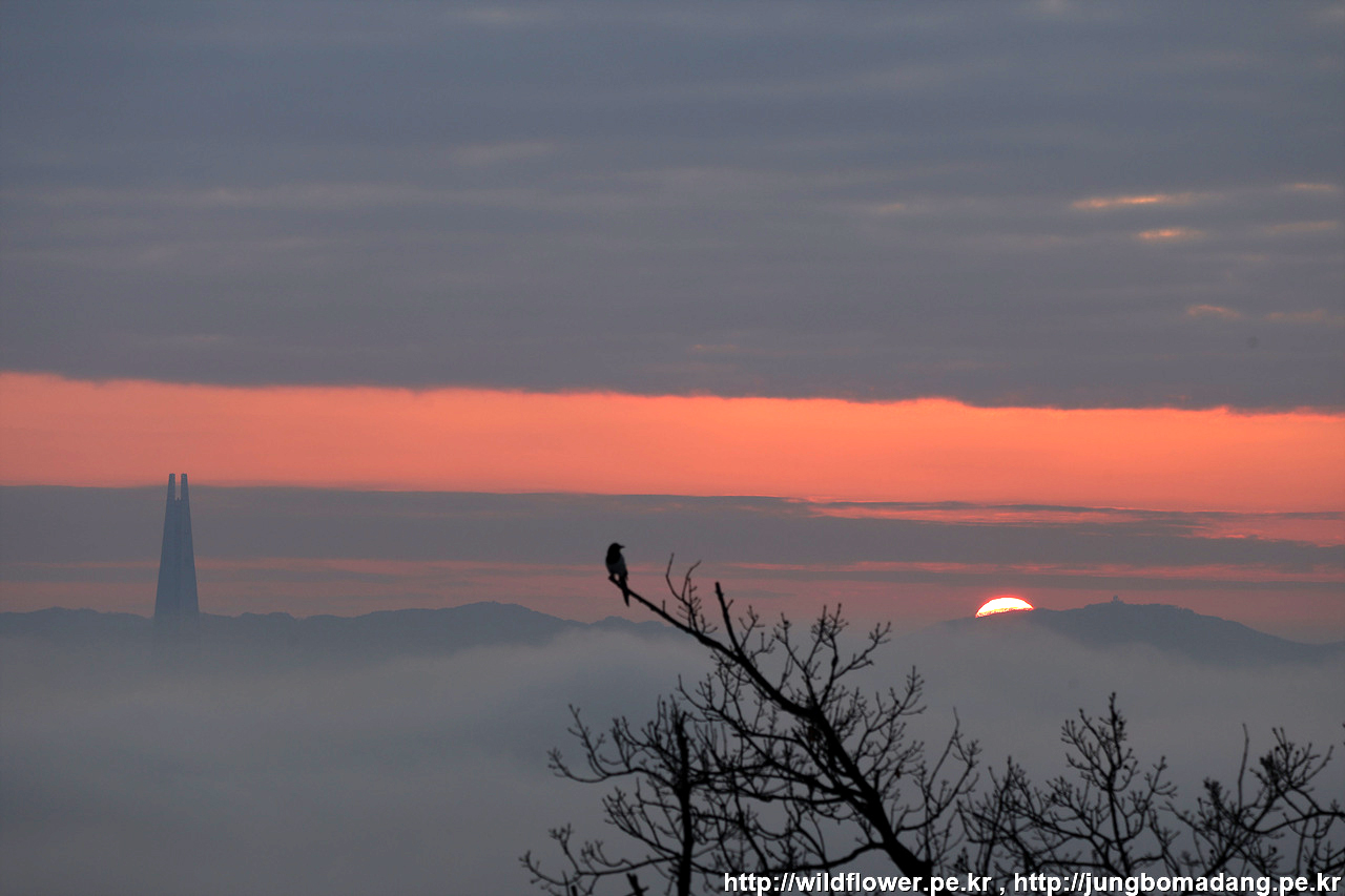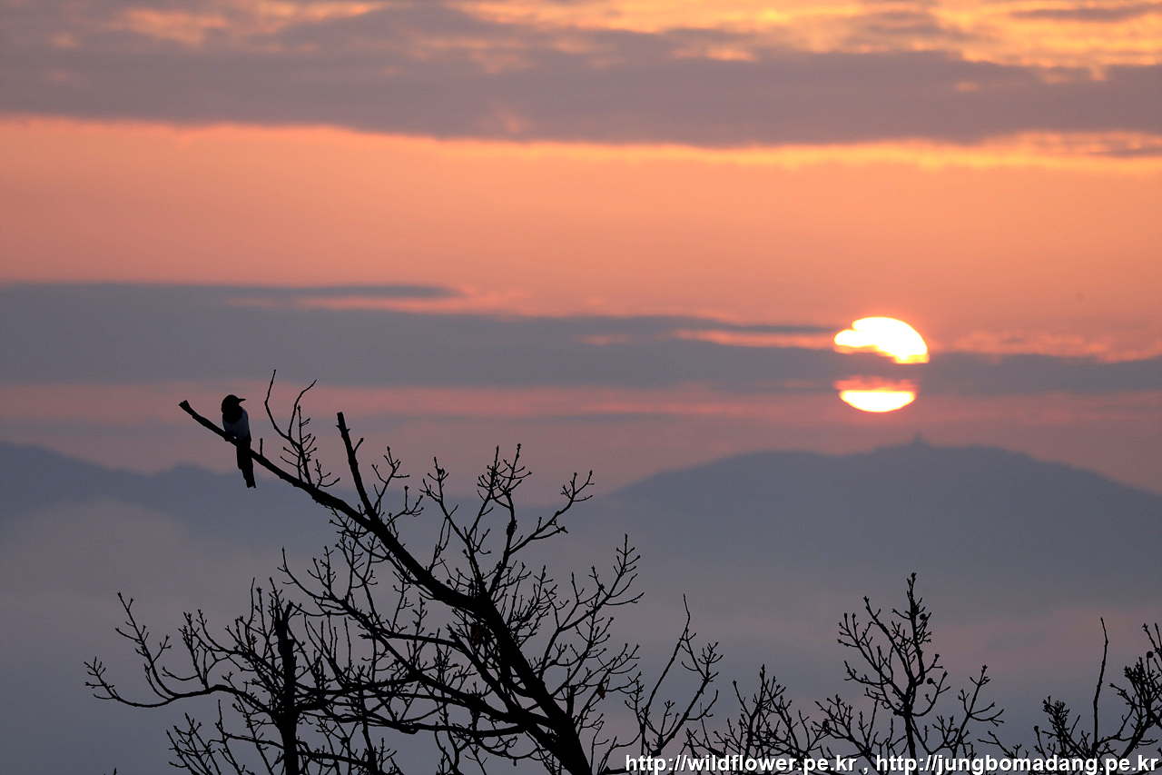 남한산성 위로 힘차게 햇님이 솟구치기 시작합니다. 근데 일출을 보기 위해 나만 온 게 아니군요? 가운데 까치 한마리 등장!