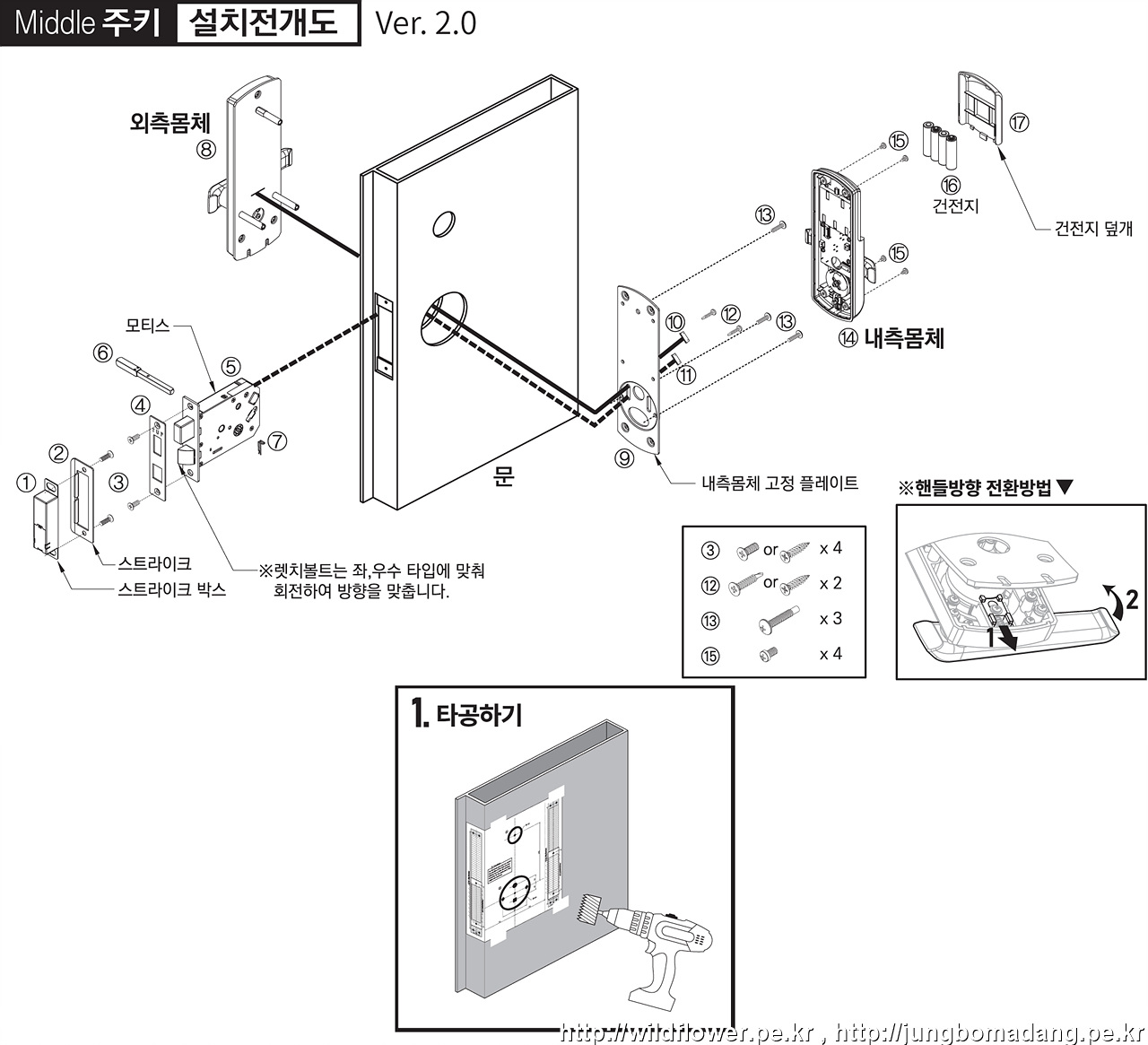 기존 도어락 제거를 완료 후 새 도어락을 설치하기 위해 설명서와 설치전개도를 살펴 봅니다.