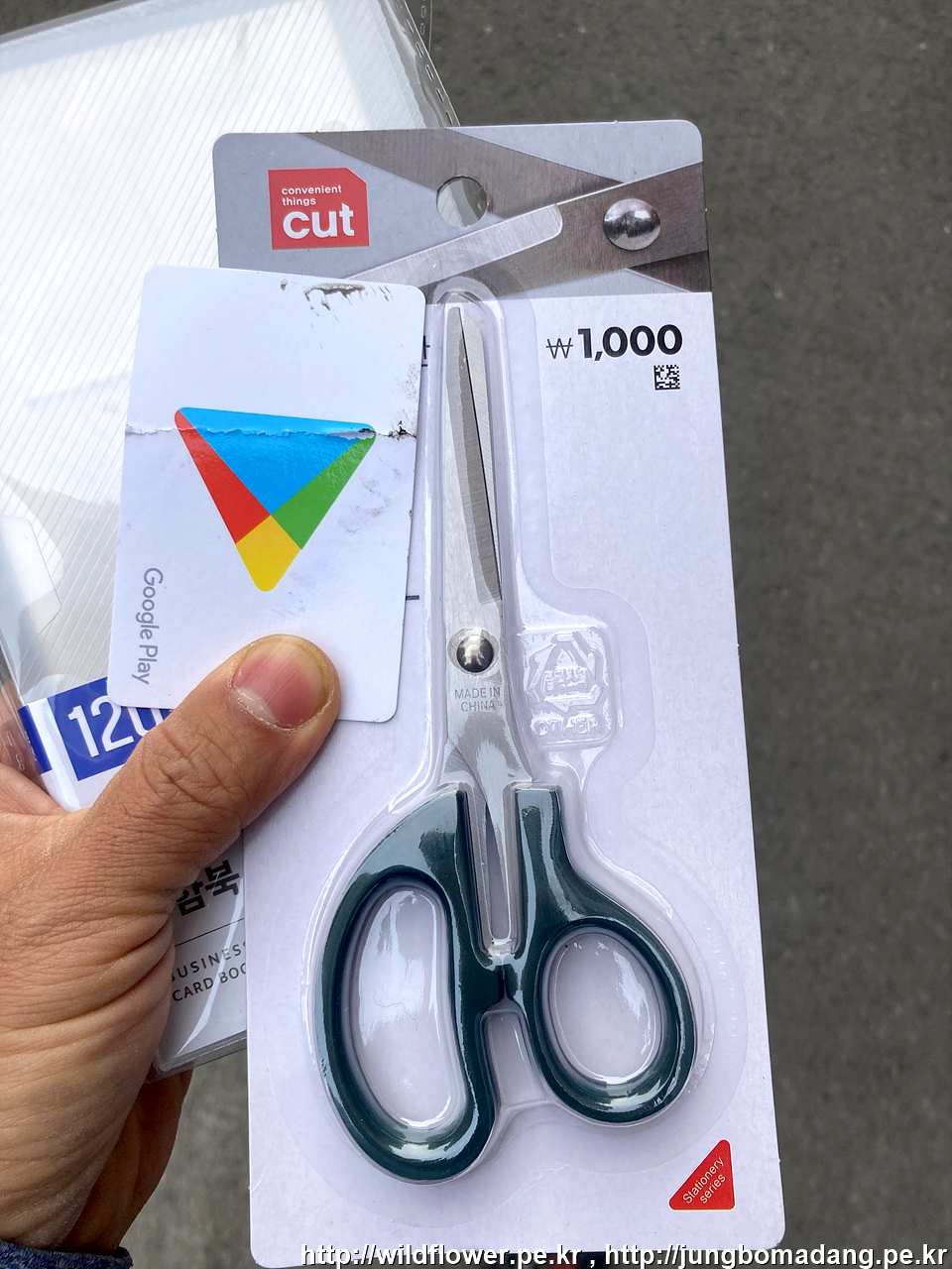 그렇게 천원짜리 가위 한개와, 천원짜리 다용도명함북 하나 구매합니다. 원래는 신용카드 같이 플라스틱 카드를 이용해볼까? 하는 데 기존에 카드를 망가트리긴 싫어서 길거리를 지나오다 버려진 폐기 카드 하나 주워 옵니다.