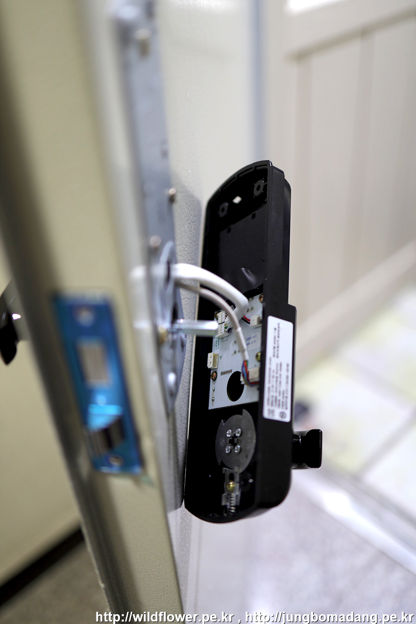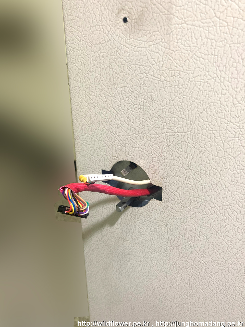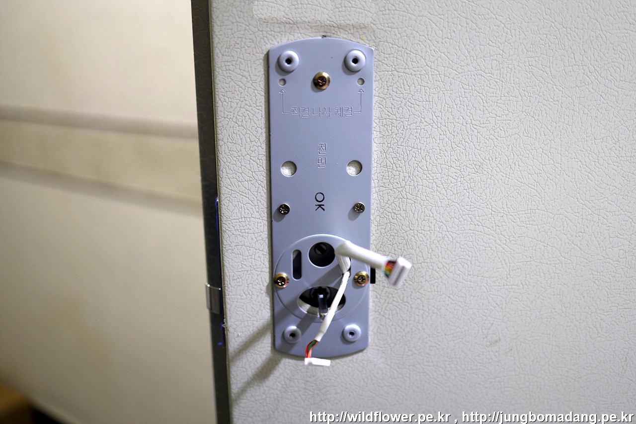 기존 도어락과 구조는 비슷하네요. 붉은색 케이블은 도어락 바깥쪽 몸체에서 들어온 것이고, 회색 케이블은 모티스라고 하여 문을 실제 열고 닫는 기계적인 장치에서 들어온 케이블입니다.