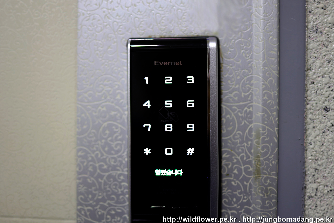 도어락에 등록된 카드키를 넣어 열렸습니다! 초록색 등이 켜기면 렛치를 안에 밀어 넣기 위해 살~ 살~ 공격!! 그리고 주키 손잡이를 땡겨 보길 여러차례...