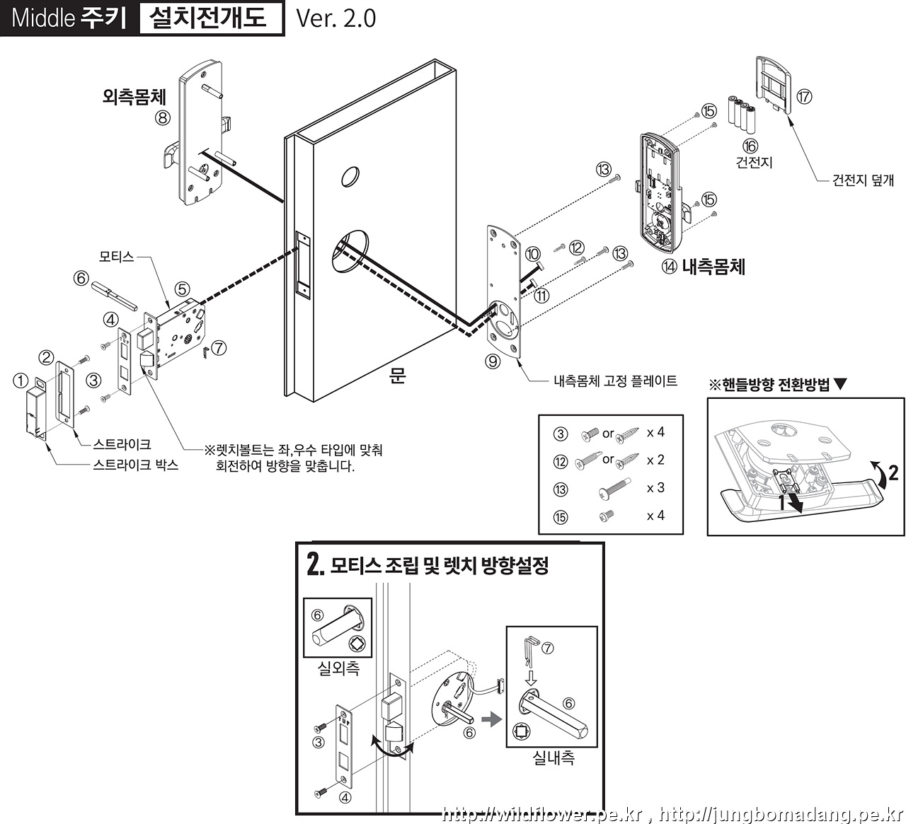 2. 모티스 조립 및 렛치 방향 설정 - 모티스 조립 시 렛치는 앞 뒤로 돌릴 수 있는 데, 현관 바깥쪽이 삼각형의 직각부분이 가도록 조정합니다. 비탈진 부분은 현관 안쪽 방향이 되겠죠. ④의 TOP 부분이 윗면으로 되도록 장착을 합니다. 아래 사진 참조.