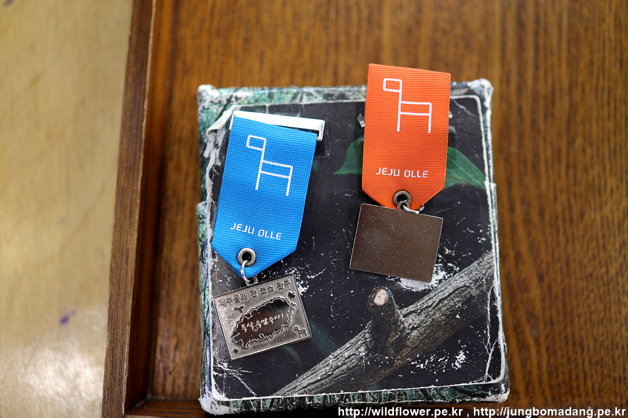 이렇게 제주올레 완주증서와 원하는 색상의 뱃지를 받을 수 있습니다. 9년전과 달라진 것은 패스포트가 2권에서 1권으로 통합되었다는 점과, 완주 인증을 스티커가 아닌 도장으로 찍어 준다는 점입니다.
