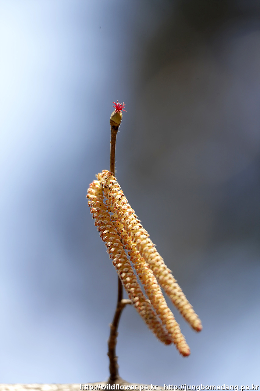 개암나무 - 길쭉하게 노란건 수꽃, 가지 끝에 적색은 암꽃입니다.