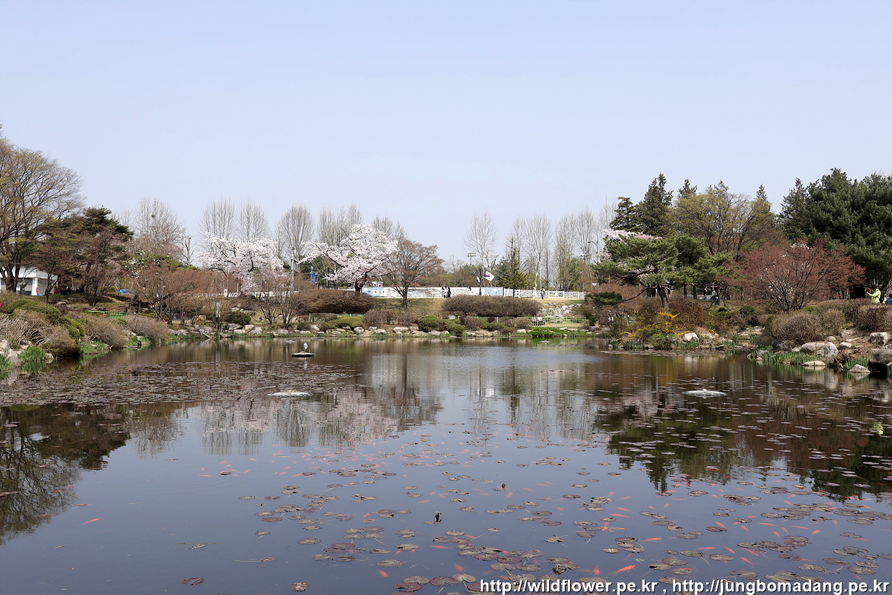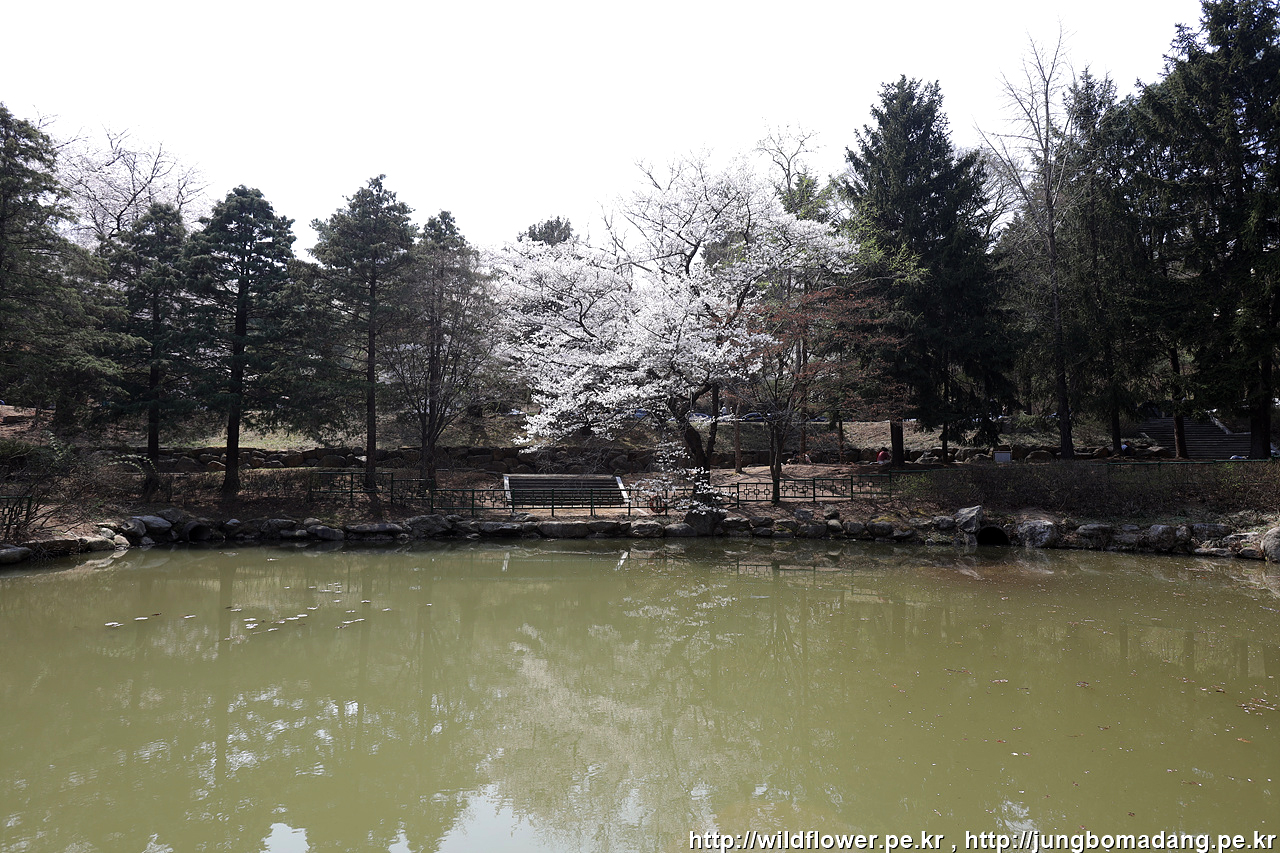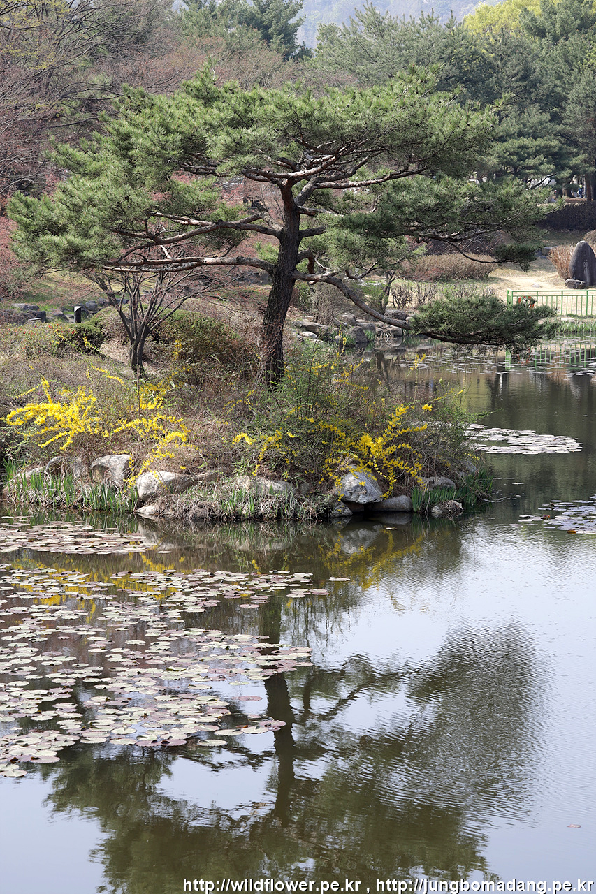 현충지 - 노란 개나리와 소나무의 반영.