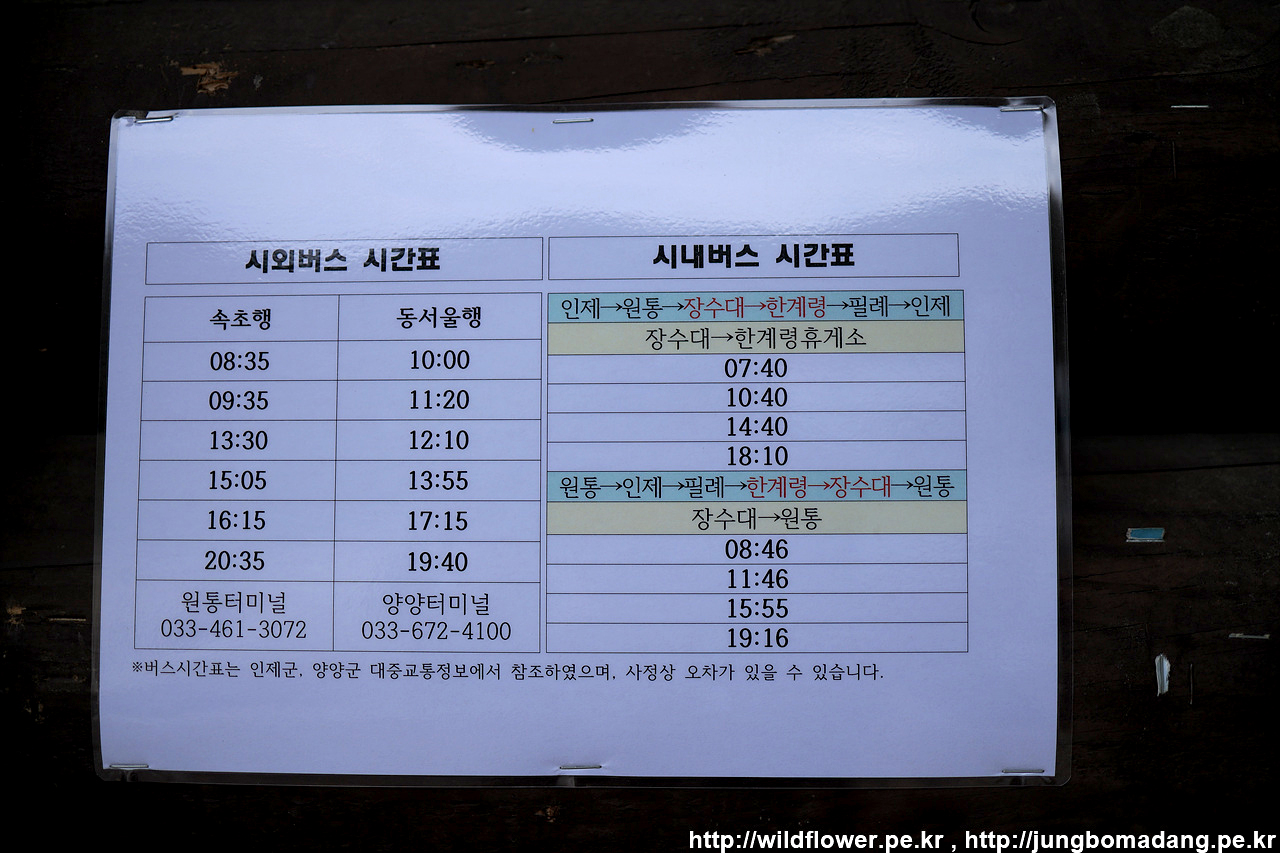 되돌아갈 것을 고려하여 장수대분소에 붙어 있는 시간표를 담아 둡니다. 7시간 산행 후 장수대로 되돌아와야 하는 데 그래서 오를 때는 느긋하게 오르 지 않기로 합니다. 장수대에서 원통으로 가는 시내버스가 15시 55분에 있네요. 작년에는 15시 45분에 탔던 기억이 있는 데 바뀌나 봅니다.