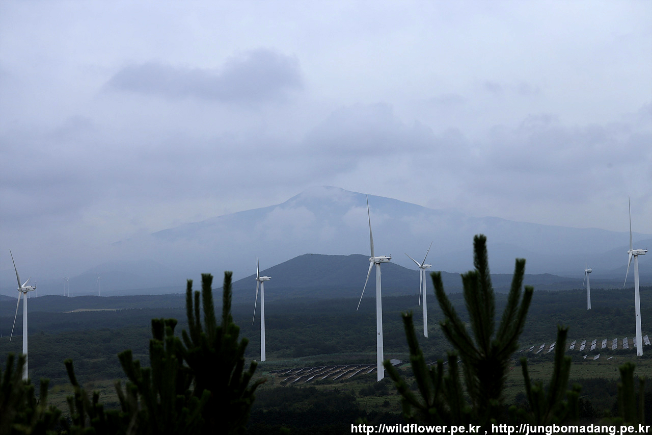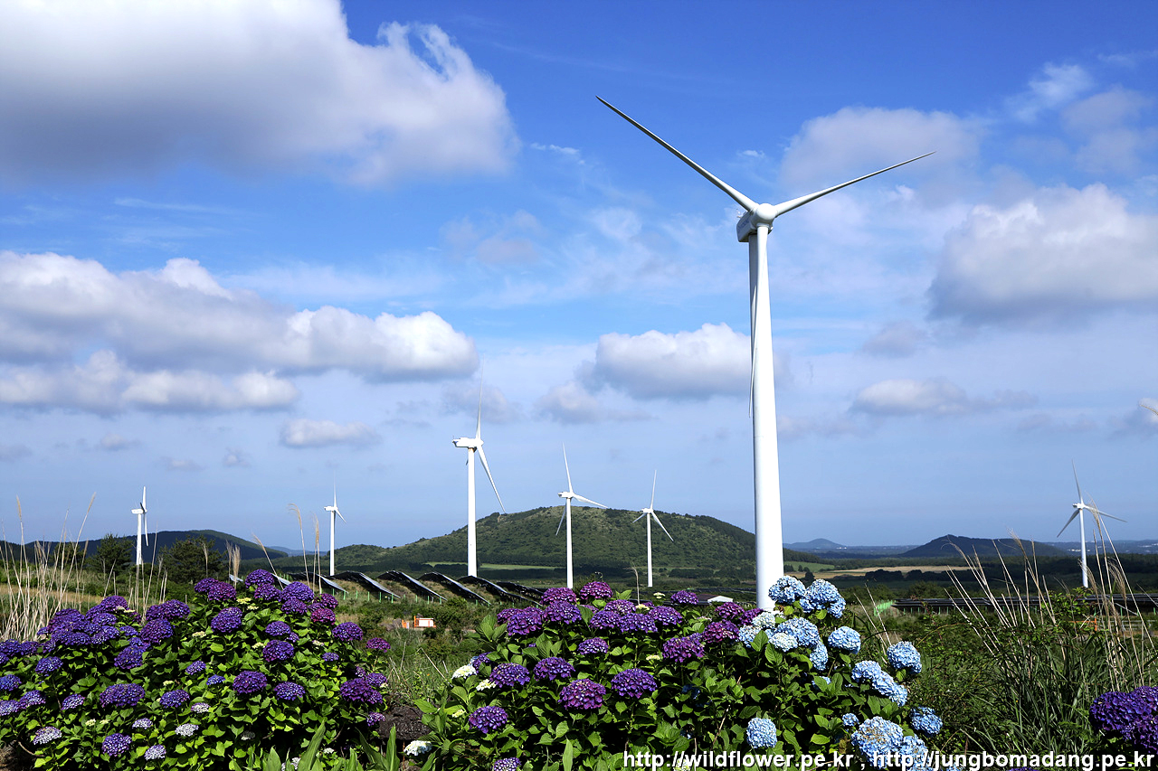 유채꽃프라자에 도착합니다. 풍력발전기와 수국 그리고 하얀 구름과 파란 하늘. 저 뒤로 따라비오름까지 조화롭네요.