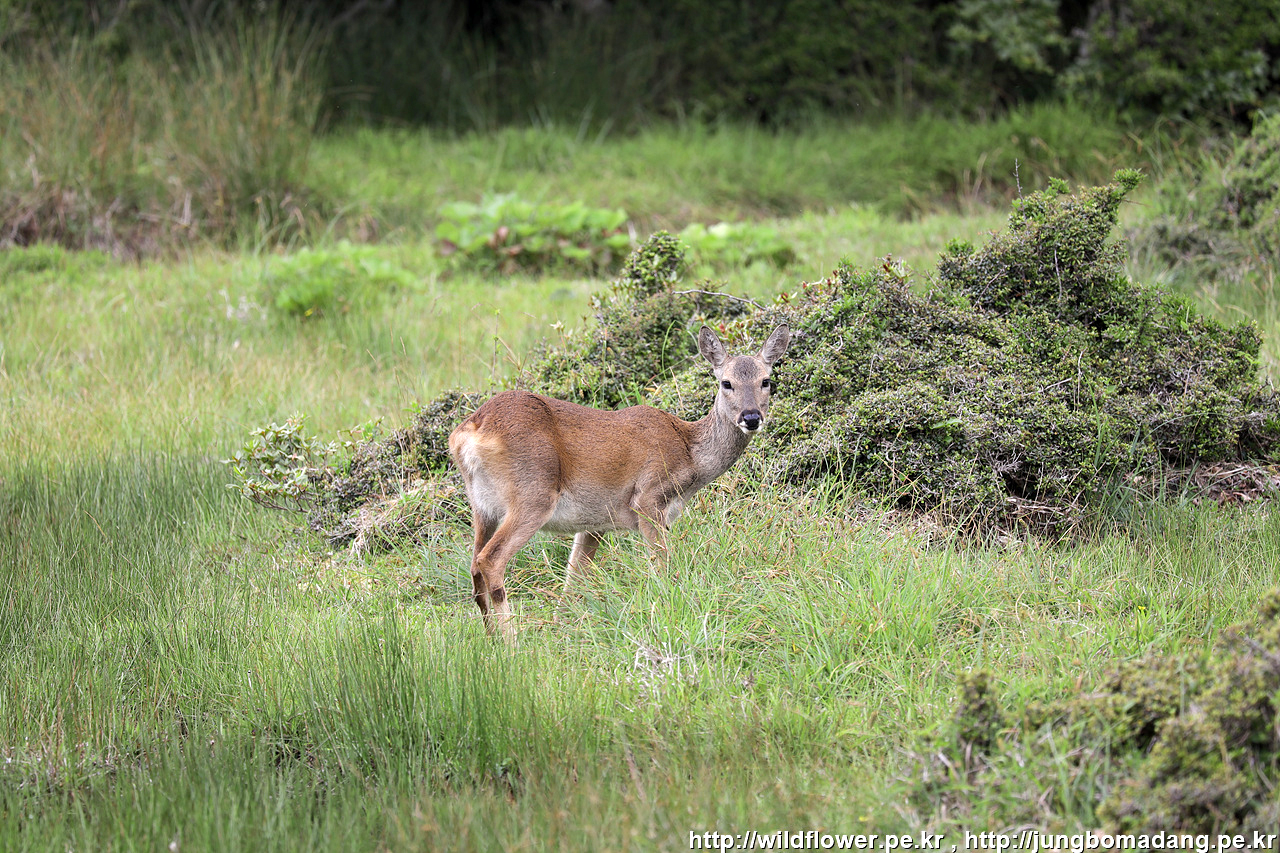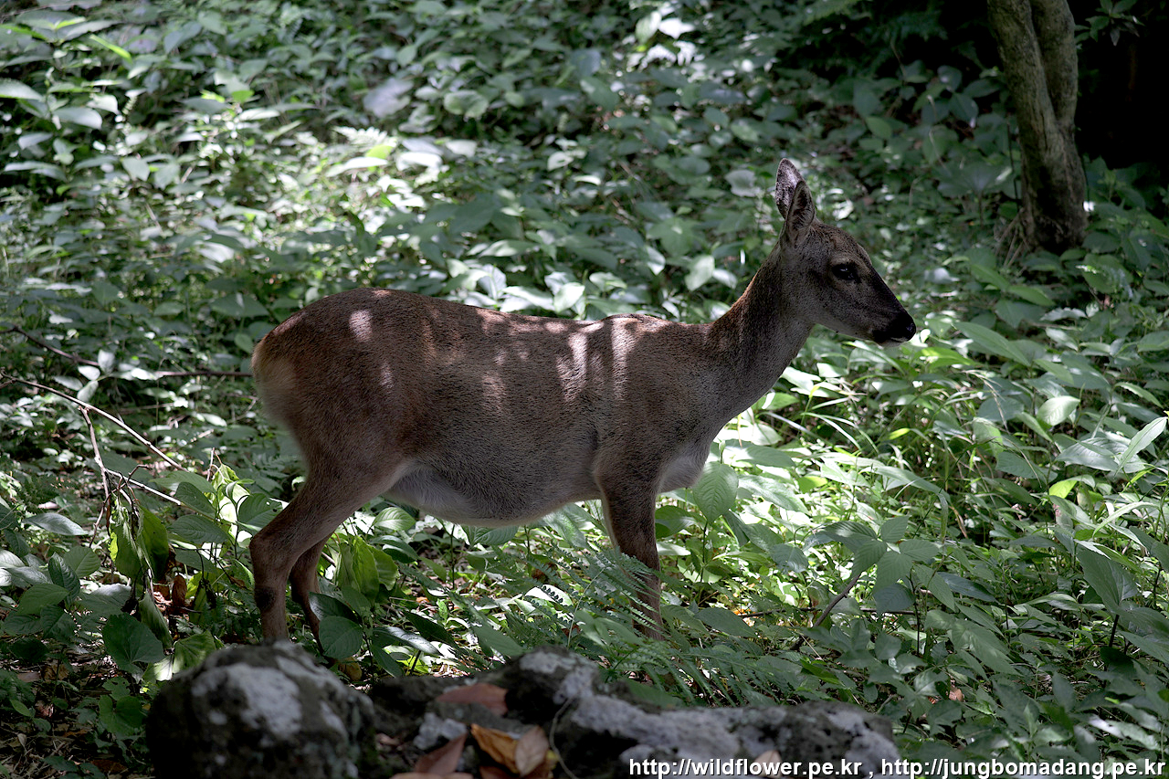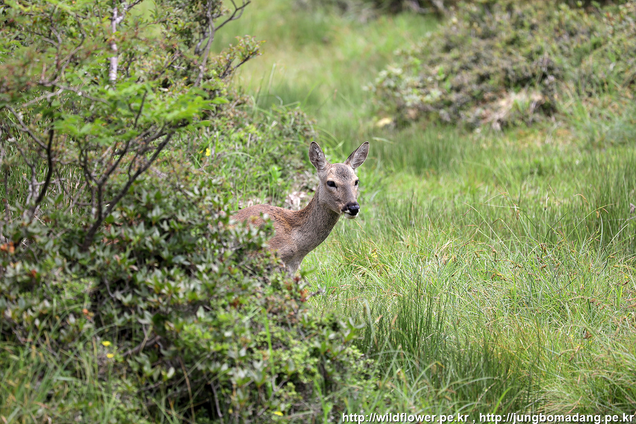 노루 한마리가 굳은 모습으로 서 있습니다.