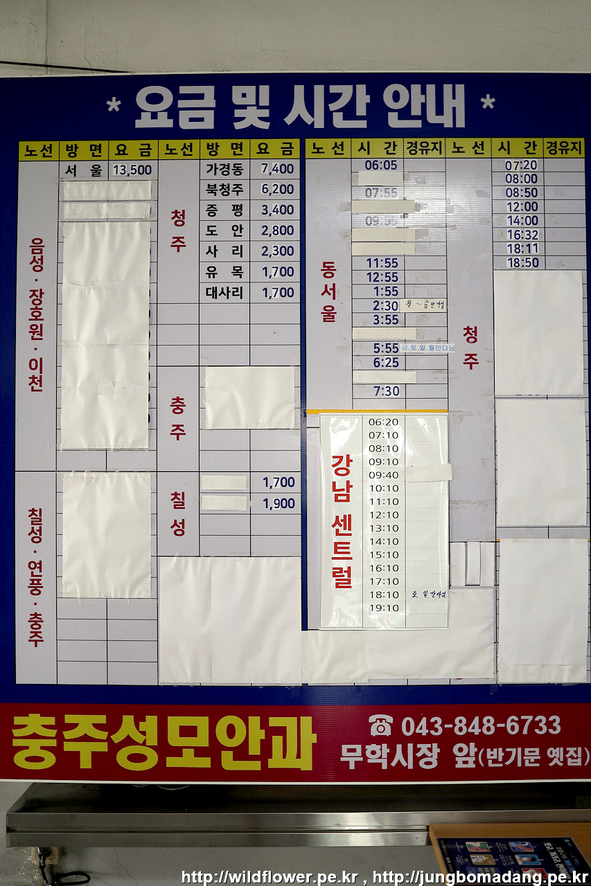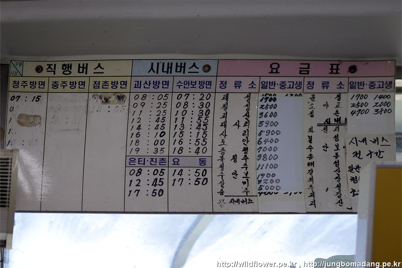버스정류장에 있는 코사마트에 괴산으로 되돌아갈 버스 시간 문의하니 시간표를 보여 주십니다.