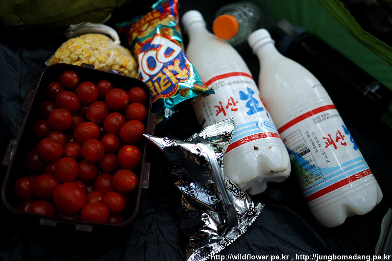 솔나리를 찾으러 가는 길! 쉬면서 간식을 보충하려는 데 모기들이 너무 많아 챙겨온 텐트에 모기장이 있는 이너만 잠시 칩니다. 편안하게 시간을 이어갑니다. 스위트콘과 방울토마토는 집에서 챙겨 온 것입니다.