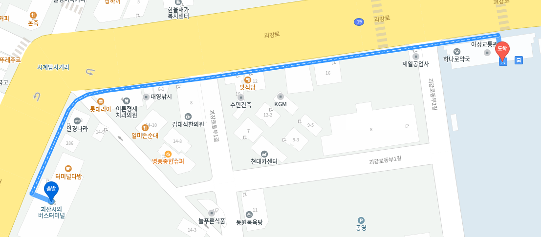시내버스를 타기 위해선 시내버스(아성교통) 터미널로 이동해야 합니다. 아래 그림처럼 약 300M(도보 4분) 거리입니다.