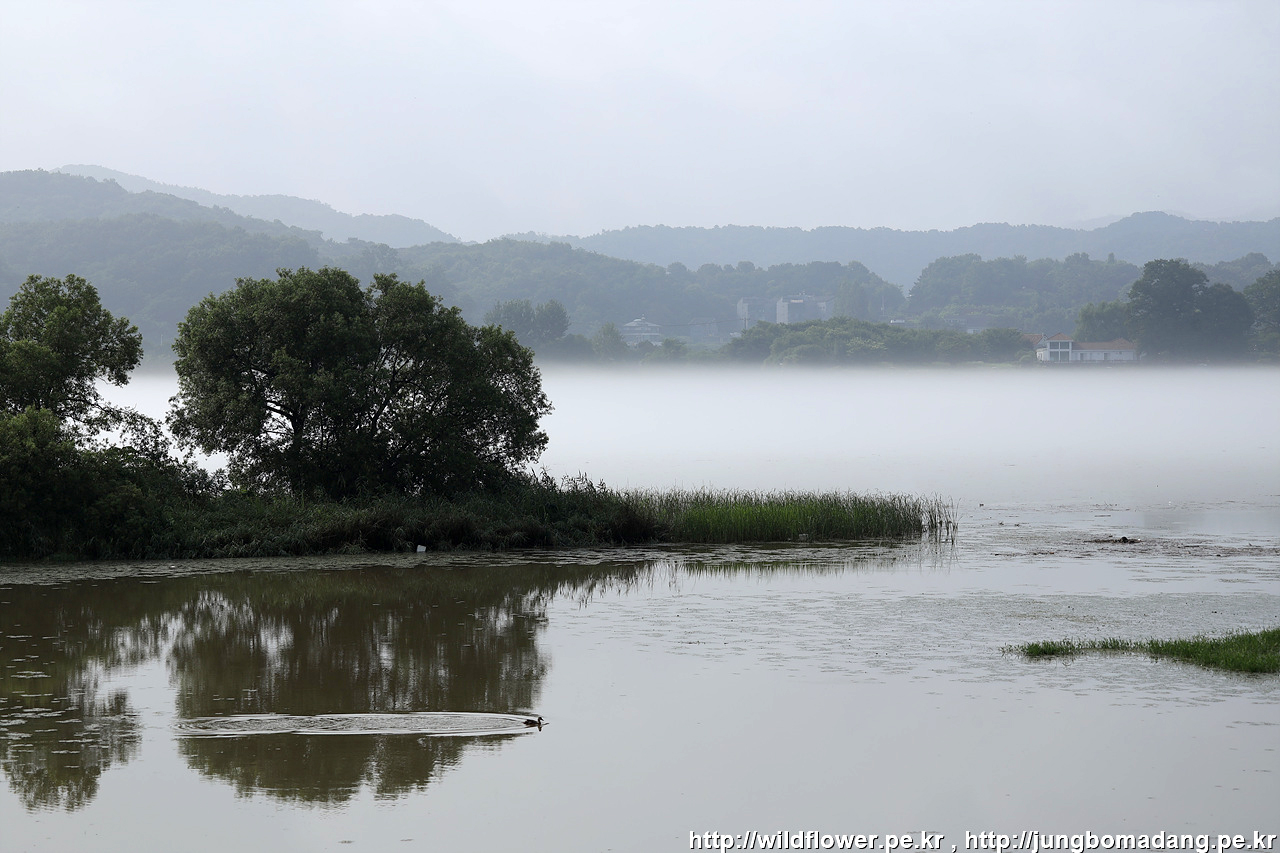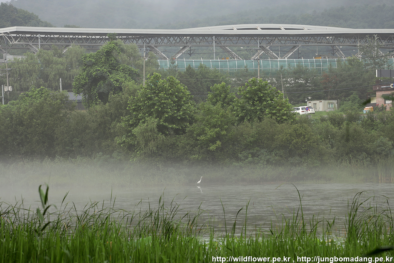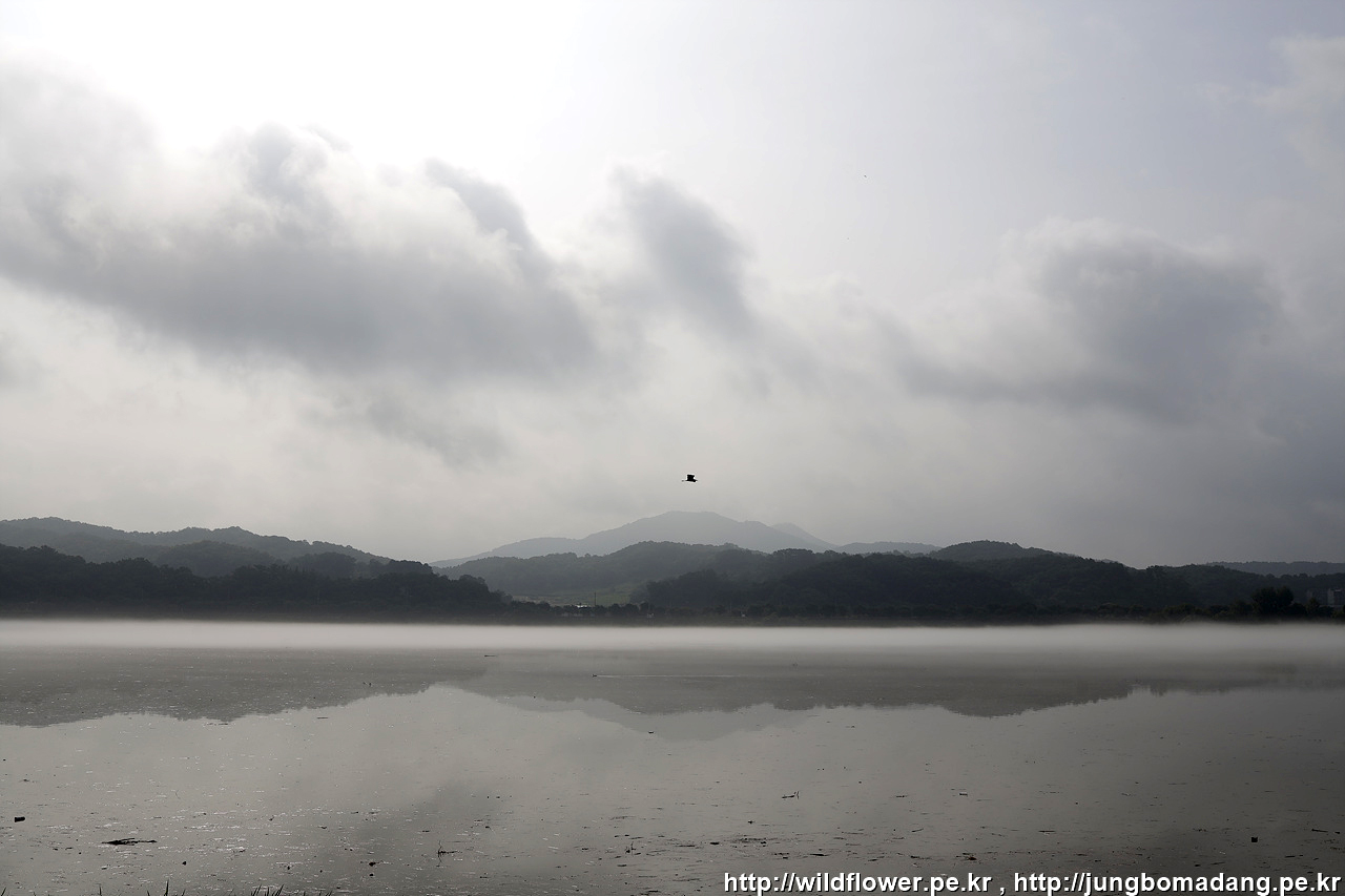 물안개 피는 북한강 위로 백로 한마리가 홀로 먹이사냥 중입니다.