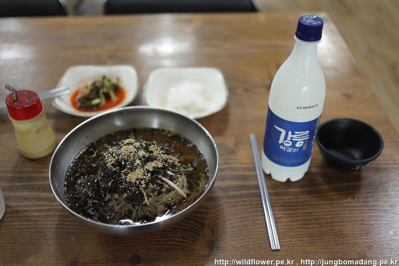 단단히 포장을 해서. 주변 식당에 와서 물막국수 곱배기에 막걸리 하나 시킵니다. 도합 15000원.