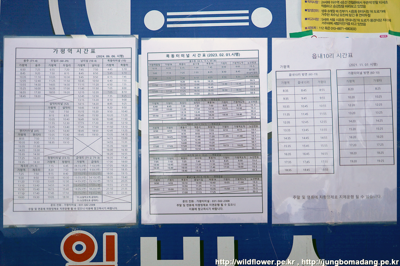 가평역 버스정류장 - 역사 나와 길 건너편에서 타야함. 공사를 하는 지 임시 정류장 표시로 되어 있고 시간표가 붙어 있네요.
