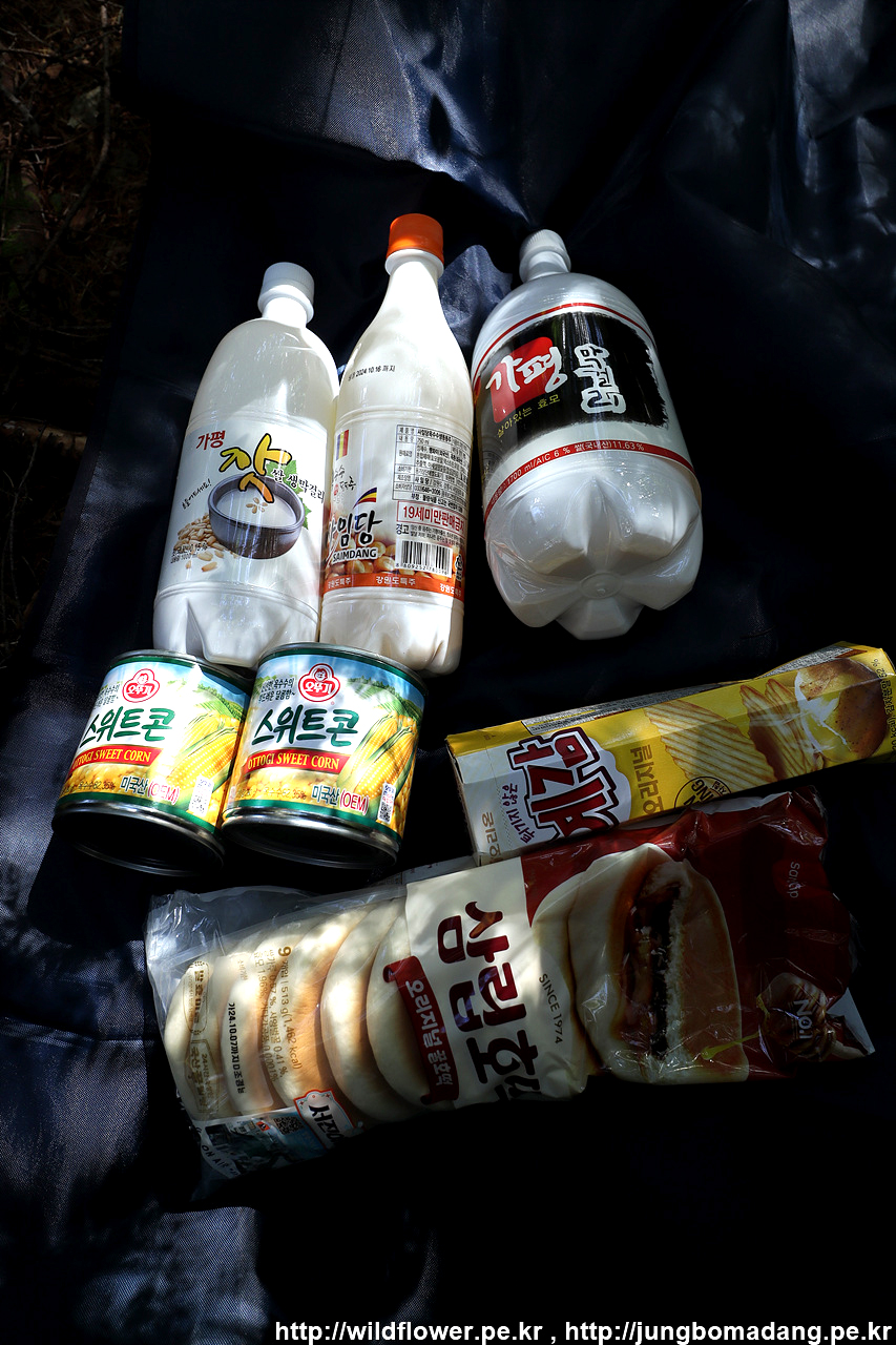 통행에 방해되지 않는 숲으로 살짝 들어 하나로마트 보급품을 몸속에 넣어 봅니다. 잣막걸리(1L)와 스위트콘, 예감 반쪽.