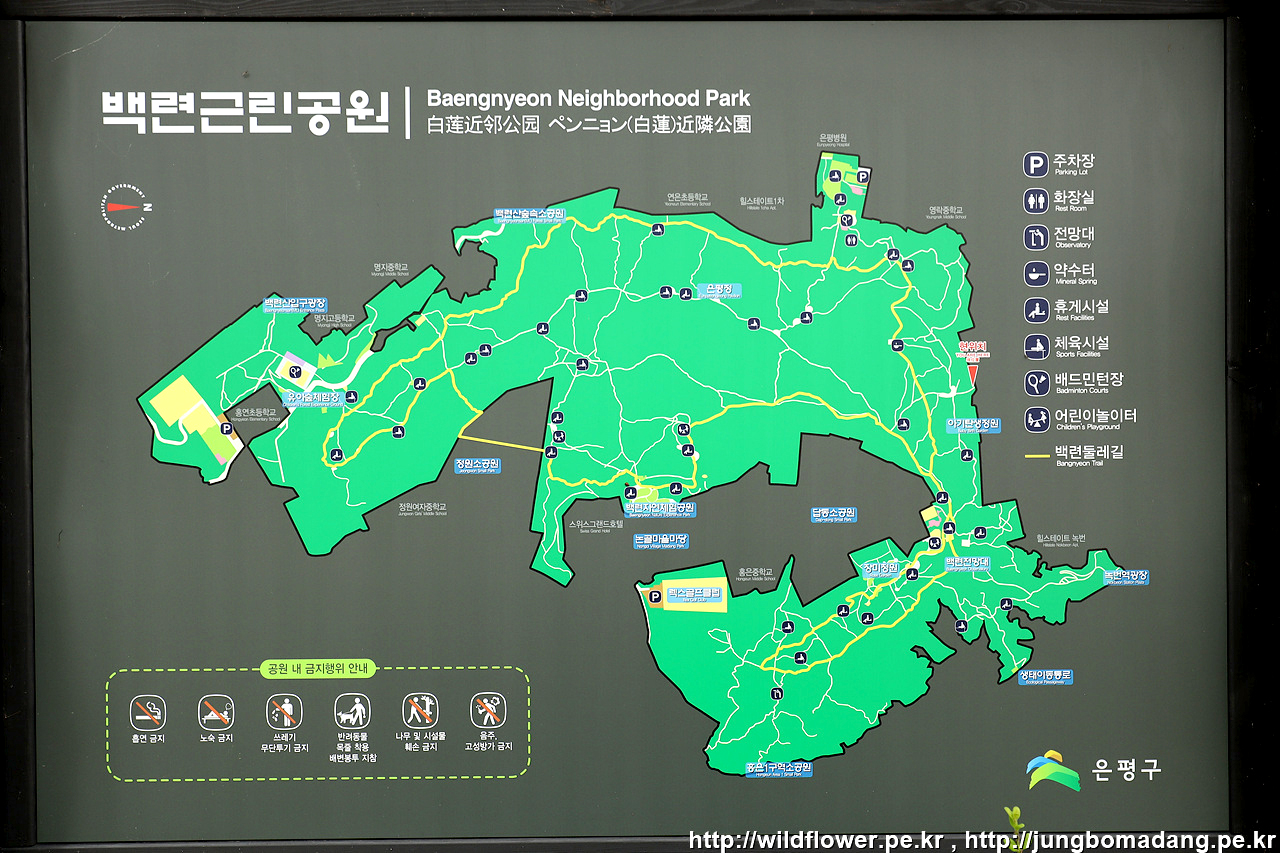 노란색 라인이 백련둘레길이며, 아래 지도를 참고해서 진행을 하였습니다. 자세하게 표시된 지도가 아니므로 일부 다를 수 있으니 참고하시길 바랍니다. 길을 찾으실 때 참고하시려면 카메라에 담는 것 보다 추가적으로 스마트폰으로 촬영하여 비교하시길 추천드립니다.