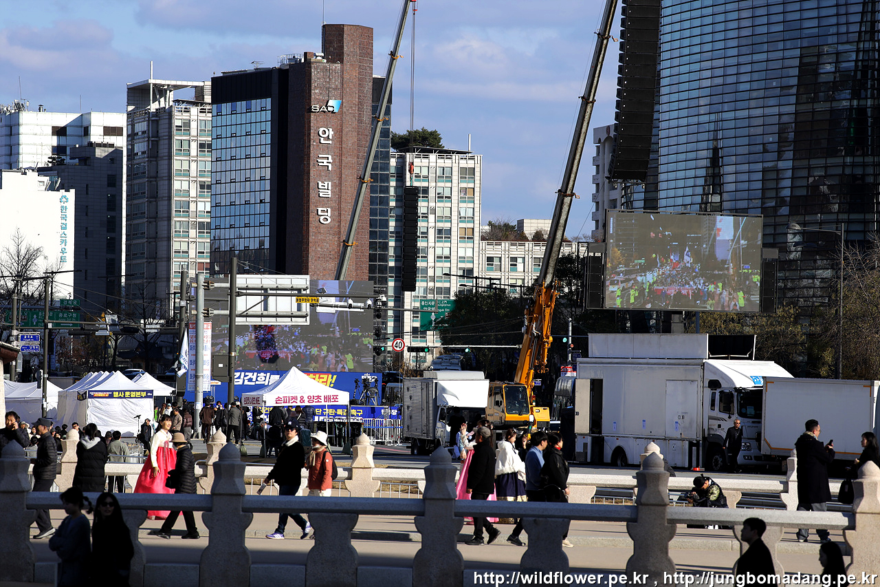 광화문 도착. 몇시간 전이지만 무대 설치되고 하나 둘 촛불 시민들이 모이기 시작합니다.