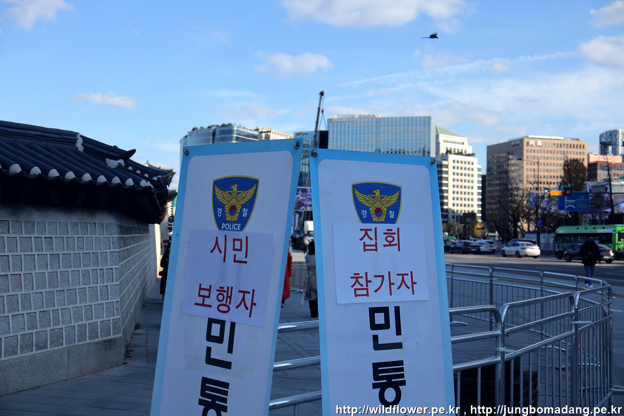경찰측에서 경복궁 앞 보행로에 시민, 보행자 - 집회 참가자 나누어서 울타리를 설치한 모습입니다.