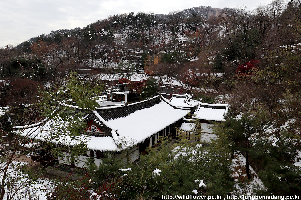 며칠 전 내린 폭설이 녹아 단풍과 어울어져 있습니다.