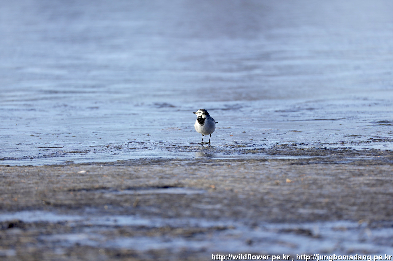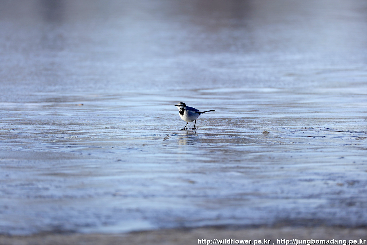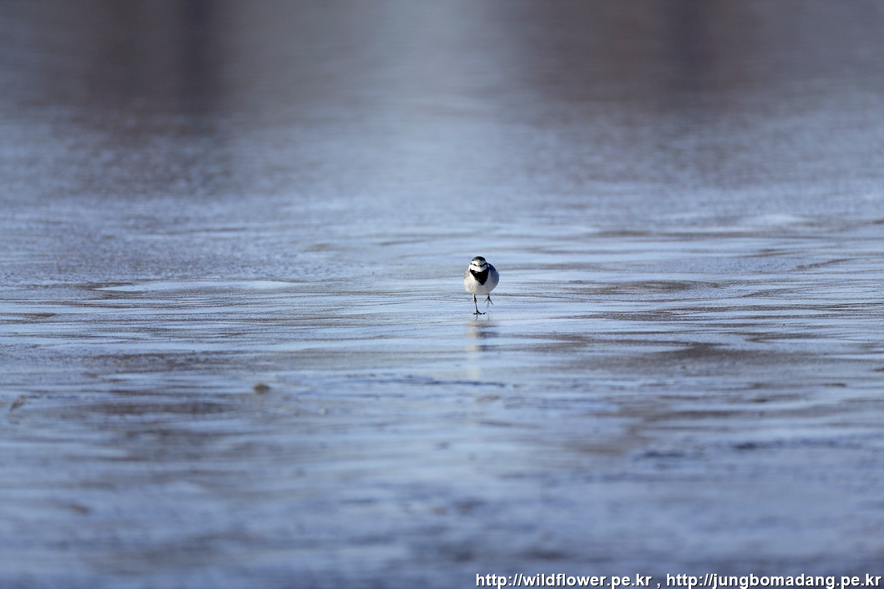 얼음 위로 새 한마리가 총총 거리며 먹이를 찾아 다닙니다.