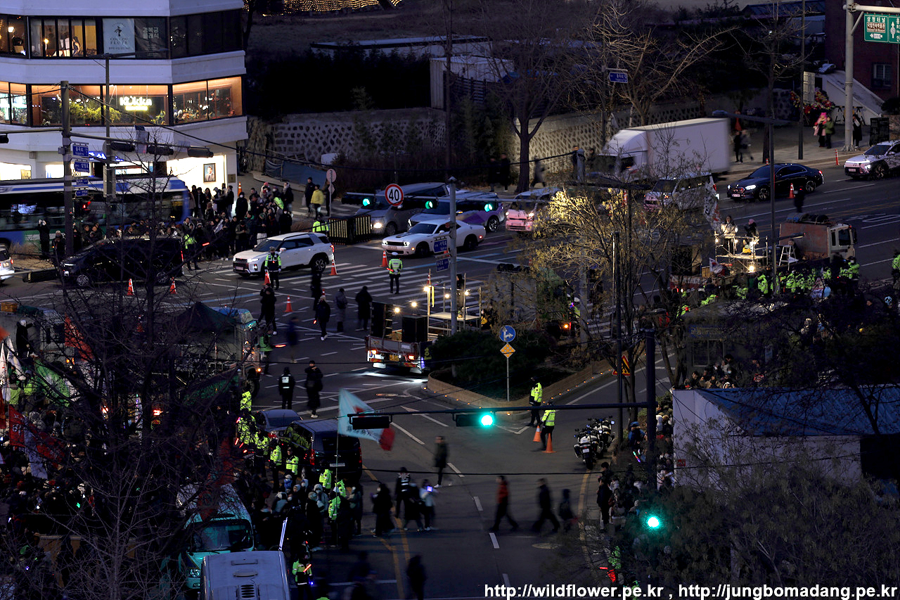 17시 7분 - 좌측편은 윤석열 탄핵을 반대하는 놈들이고, 우측이 제가 속한 하루빨리 윤석열이를 탄핵 마무리 하기 위해 모인분들입니다. 다행히 경찰측에서 충돌 방지를 위해 버스도 갖다 놓고 인간띠를 만들었네요.