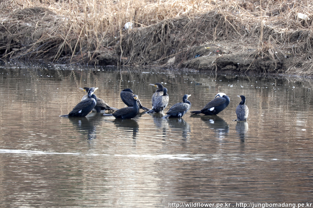 민물가마우지 무리 - 머리가 하얀 것은 번식깃입니다.