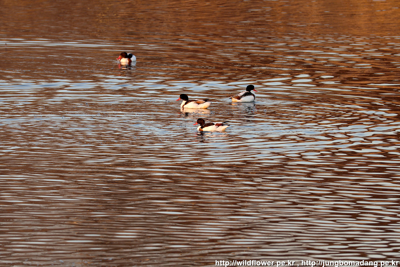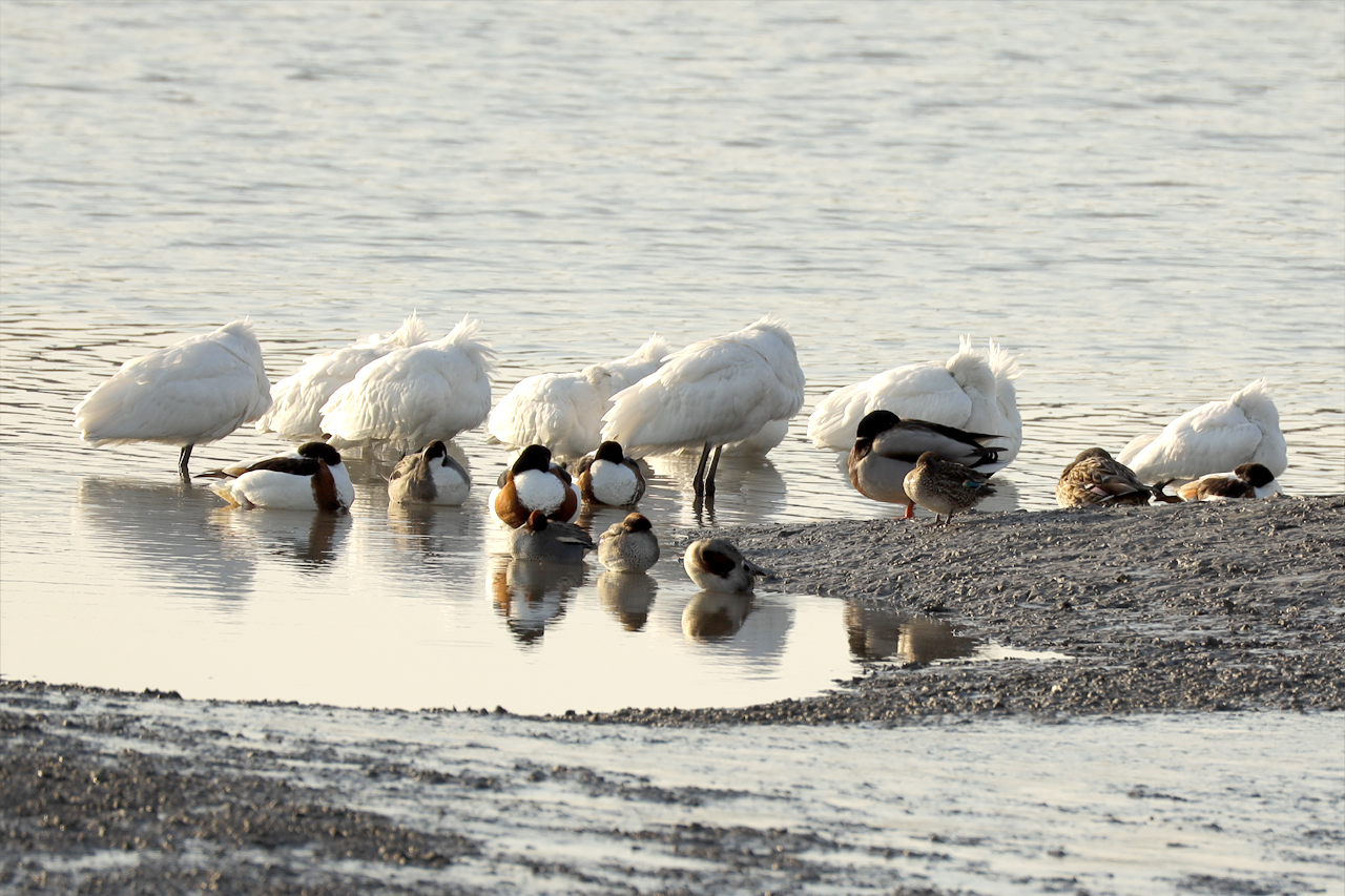 바닷가 갯벌쪽에도 저어새 무리가 보입니다. 저어새 아래 혹부리오리 무리가 보입니다.